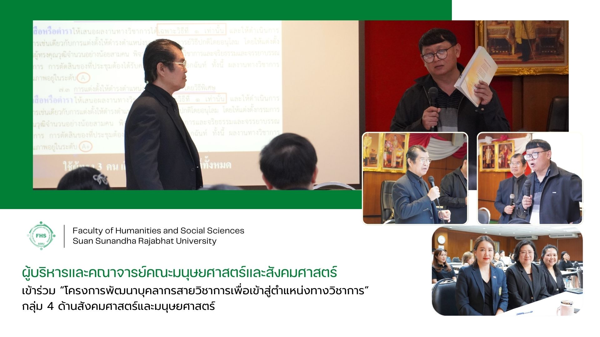 December 8, 2025, at 13:00 hrs. - Dr. Napasri Suwanajote, Dean of the Faculty of Humanities and Social Sciences, along with the executives and lecturers, attended the "Academic Staff Development Project for Higher Academic Positions" for Group 4 (Social Sciences and Humanities), organized by the Division of Personnel Management, where Dr. Prayong Saenburan and Prof. (Yanawit) Dr. Alongklod Tanomthong served as guest speakers at the Nibha Nobhadol Meeting Room on the 2nd Floor of Building 35, Faculty of Humanities and Social Sciences, Suan Sunandha Rajabhat University.