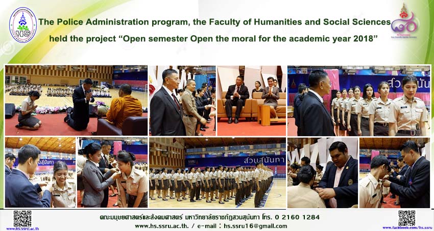 On November 16th, 2018 the Police Administration program, the Faculty of Humanities and Social Sciences held the project “Open semester Open the moral for the academic year 2018” at Health and Sports Center Building. The objective of this project is creating morale for the students from the Police Administration program. On this occasion, Professor Police Lieutenant General Dr. Naiyana Kerdvichai to be an honor for presided over the ceremony including with the lecturers from the Police Administration program and the Royal Police Cadet Academy, Sam Phran attended to the ceremony. Moreover, there were badged for the level and the badge for the students who is the commander in the group.