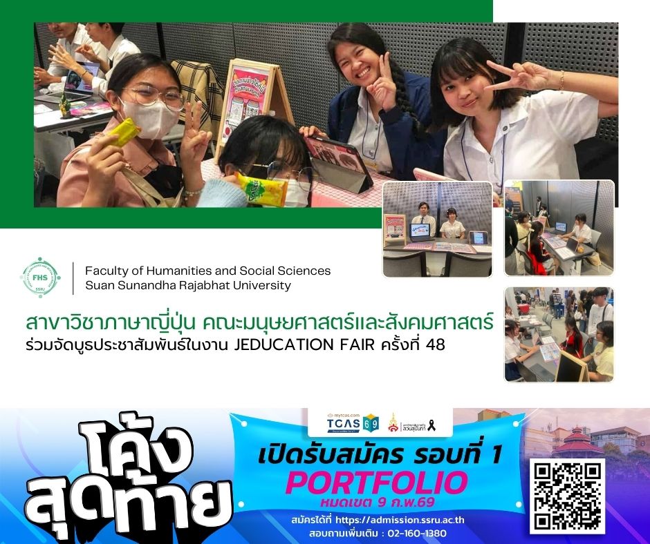 January 31 - February 1, 2026 - The Japanese Program of the Faculty of Humanities and Social Sciences, Suan Sunandha Rajabhat University, participated in the 48th JEDUCATION FAIR at the Grand Hall, 3rd Floor, True Digital Park (West Side), provided comprehensive academic information and curriculum guidance, helping prospective students explore their educational paths in Japanese studies and plan their future careers with confidence, and offered: