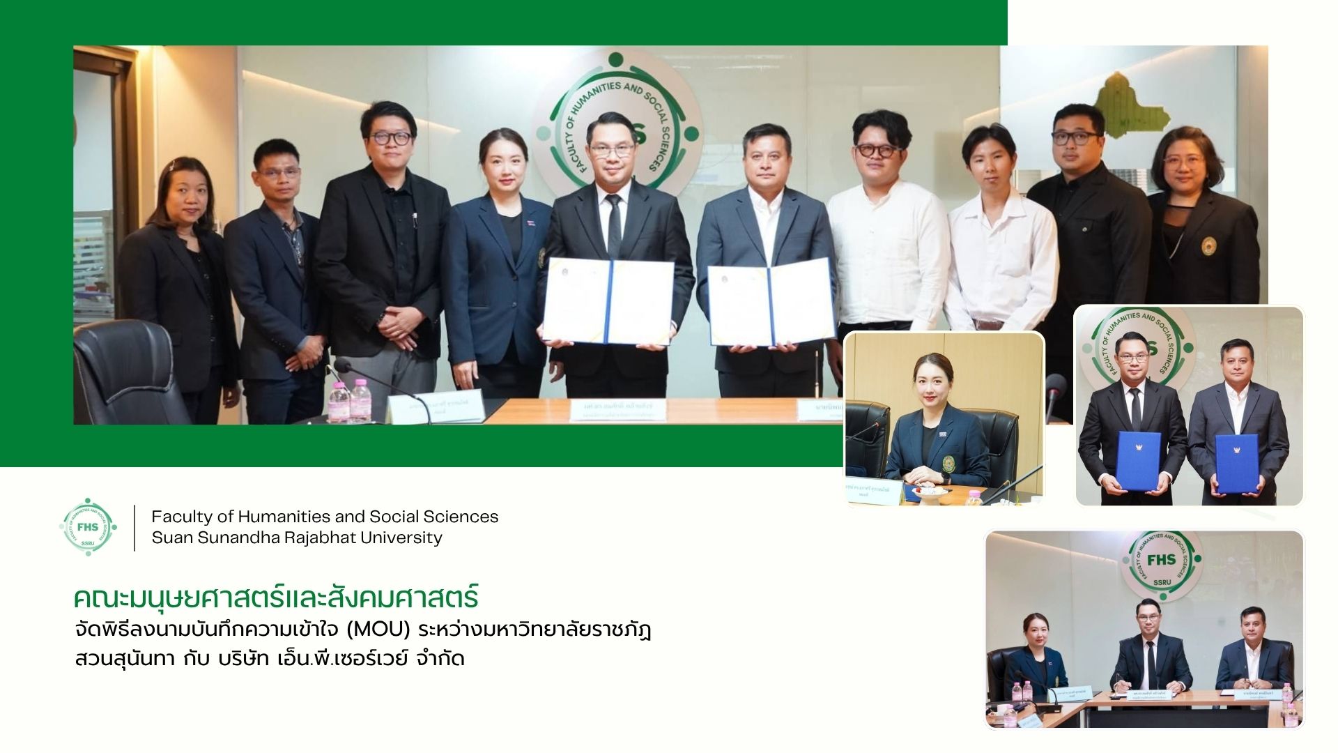 November 19, 2025, at 10:00 hrs. – Dr. Napasri Suwanajote, Dean of the Faculty of Humanities and Social Sciences, participated in the Memorandum of Understanding (MoU) signing ceremony between Suan Sunandha Rajabhat University and N.P. Survey Company Limited, where Asst. Prof. Dr. Somsak Klaysung, Vice President for Student Affairs, was the representative of the university, and Mr. Niphon Hongin, Managing Director, was the representative of the company, along with the associate deans, lecturers, and staff of the Faculty of Humanities and Social Sciences in Pornsopin Meeting Room on the 1st Floor of Building 35.