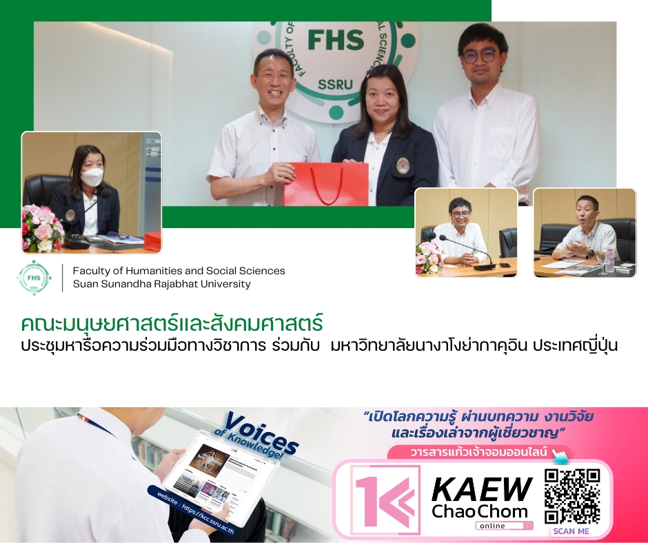 February 20, 2026, 11:30 hrs. - Mr. Shibata Yasunori, Director of the International Center from Nagoya Gakuin University, Japan, discussed with Dr. Aungkana Sukwises, Associate Dean for Academic Affairs, and Asst. Prof. Kachaphat Limjaroen, Head of the Japanese Program on student exchange collaboration, at Pornsopin Meeting Room on the 1st Floor of Building 35, Faculty of Humanities and Social Sciences, Suan Sunantha Rajabhat University.