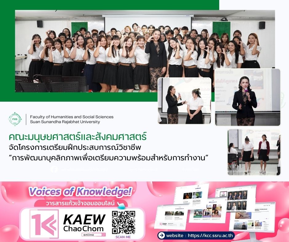 January 30, 2026, 9:00 hrs. - The Academic Services Department of the Faculty of Humanities and Social Sciences, Suan Sunandha Rajabhat University, organized a Professional Internship Preparation Project on "Personality Development for Career Readiness," aimed to enhance student confidence before entering the workforce by teaching essential techniques in professional attire, etiquette, and credible communication, and ensuring students stand out in every interview and career opportunity, where it was honored to have Ms. Suwita Pruksaaporn, Deputy Director for Administration and Planning at the Academic Service Center and lecturer of the Organizational Leadership Development Innovation program (Distance Learning), as the guest speaker at Classroom 3556 on the 5th Floor of Building 35, Faculty of Humanities and Social Sciences.