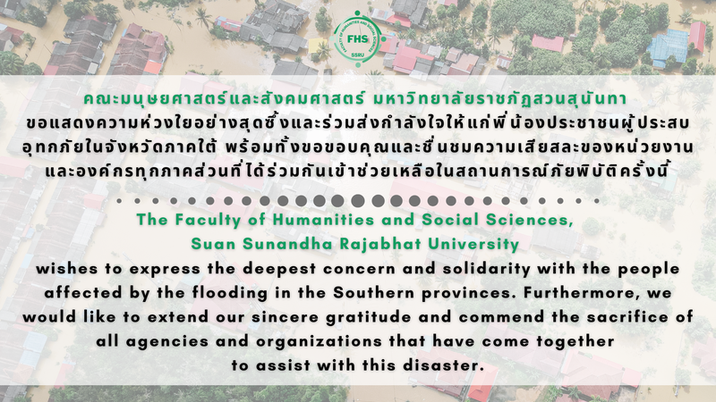 The Faculty of Humanities and Social Sciences, Suan Sunandha Rajabhat University, wishes to express the deepest concern and solidarity with the people affected by the flooding in the Southern provinces. Furthermore, we would like to extend our sincere gratitude and commend the sacrifice of all agencies and organizations that have come together to assist with this disaster.