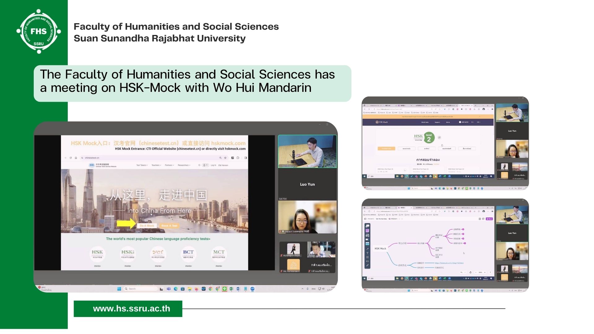 July 1, 2025, 09:00 hrs. – Dr. Napasri Suwanajote, Dean of the Faculty of Humanities and Social Science had a meeting on HSK-Mock with Wo Hui Mandarin, together with Dr. Angvarrah Lieungnapar (Associate Dean for Business Development and Revenue Generation), Asst. Prof. Anantachai Aeka (Assistant to the Dean or Business Development and Revenue Generation), Asst. Prof. Acting Sub Lt. Dr. Kriangkrai Kongseng (Head of the Chinese Program), and Aj. Luo Yun (Chinese Program lecturer) attended via Zoom meeting.