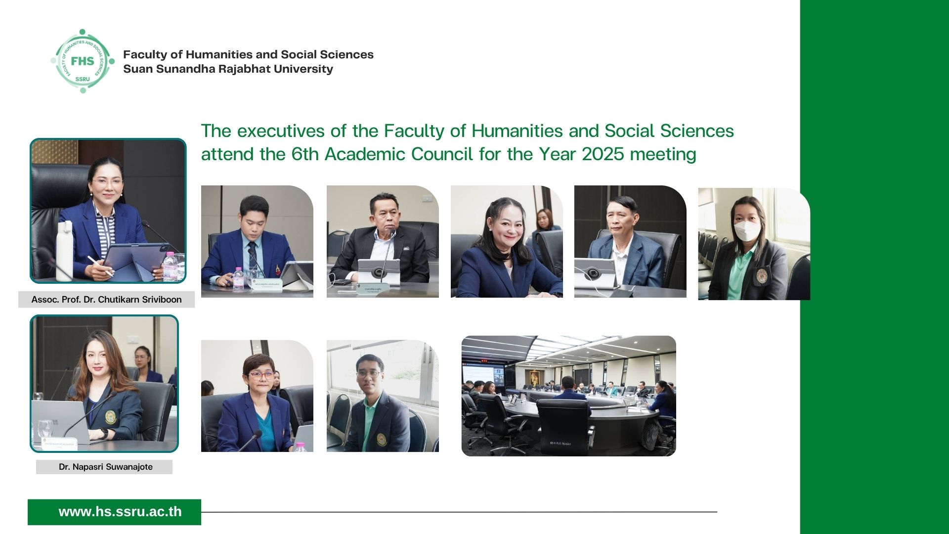 June 21, 2025, 09:00 hrs. - Dr. Napasri Suwanajote, Dean of the Faculty of Humanities and Social Sciences attended the 6th Academic Council for the Year 2025 meeting, hosted by the Education Services Division, where Assoc. Prof. Dr. Chutikarn Sriviboon, President was a chair, together with Dr. Aungkana Sukwises, Associate Dean for Academic Affairs, and Mr. Panuwat Ubonyam, Head of the Educational Services Division attended at the University Council Meeting Room, 5 Fl., Building 31, Suan Sunandha Rajabhat University.