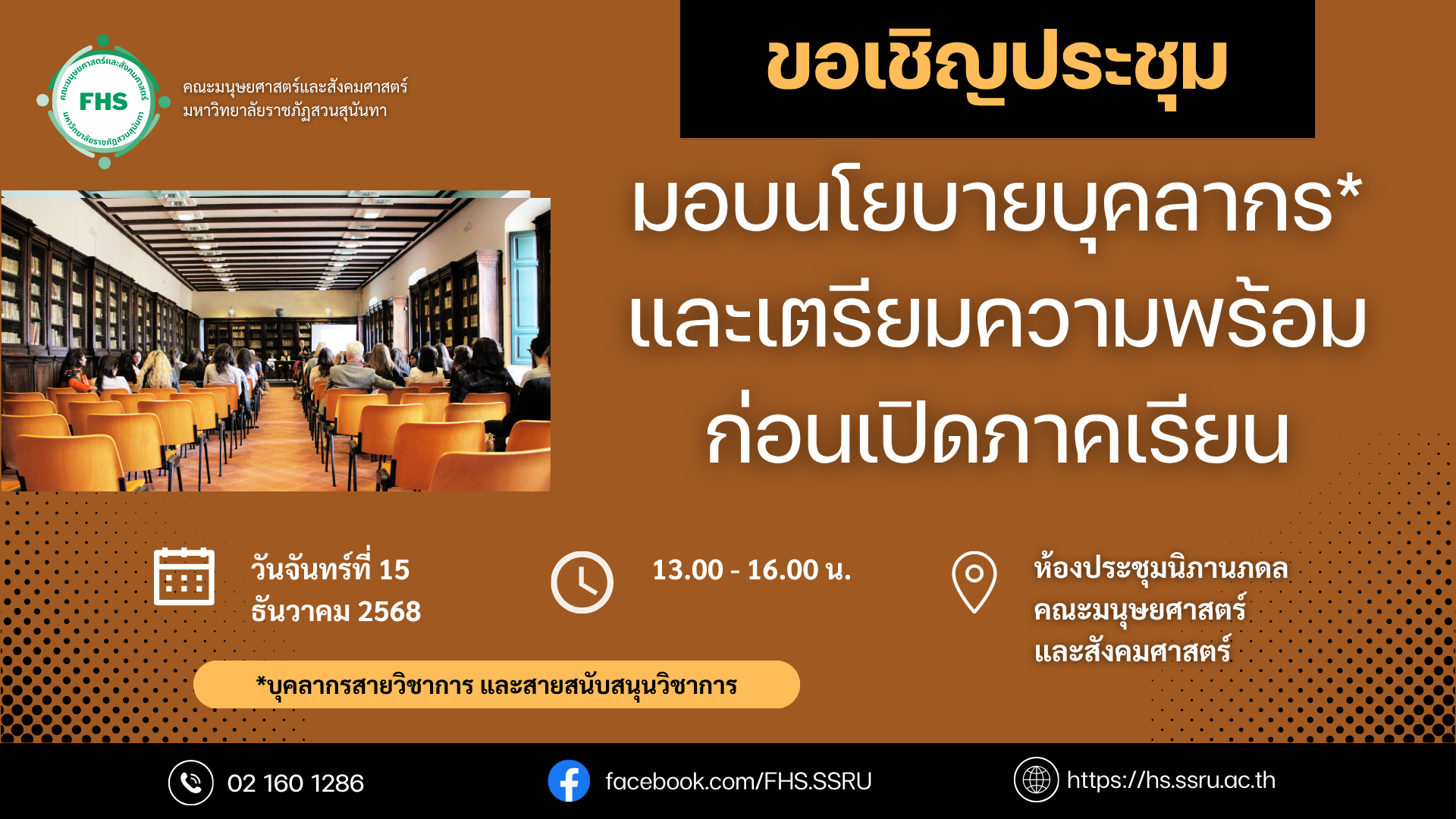 The Faculty of Humanities and Social Sciences, Suan Sunandha Rajabhat University, invites all staff to participate in the meeting on “Policy Briefing and Preparation Before the Start of the Semester.”