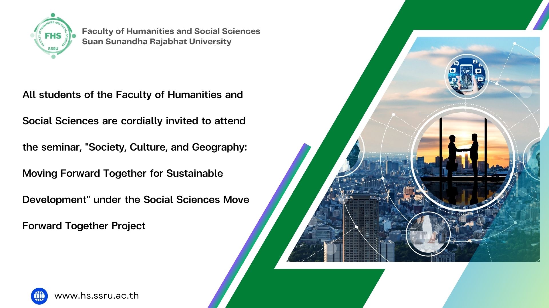 All students of the Faculty of Humanities and Social Sciences are cordially invited to attend the seminar, "Society, Culture, and Geography: Moving Forward Together for Sustainable Development" under the Social Sciences Move Forward Together Project