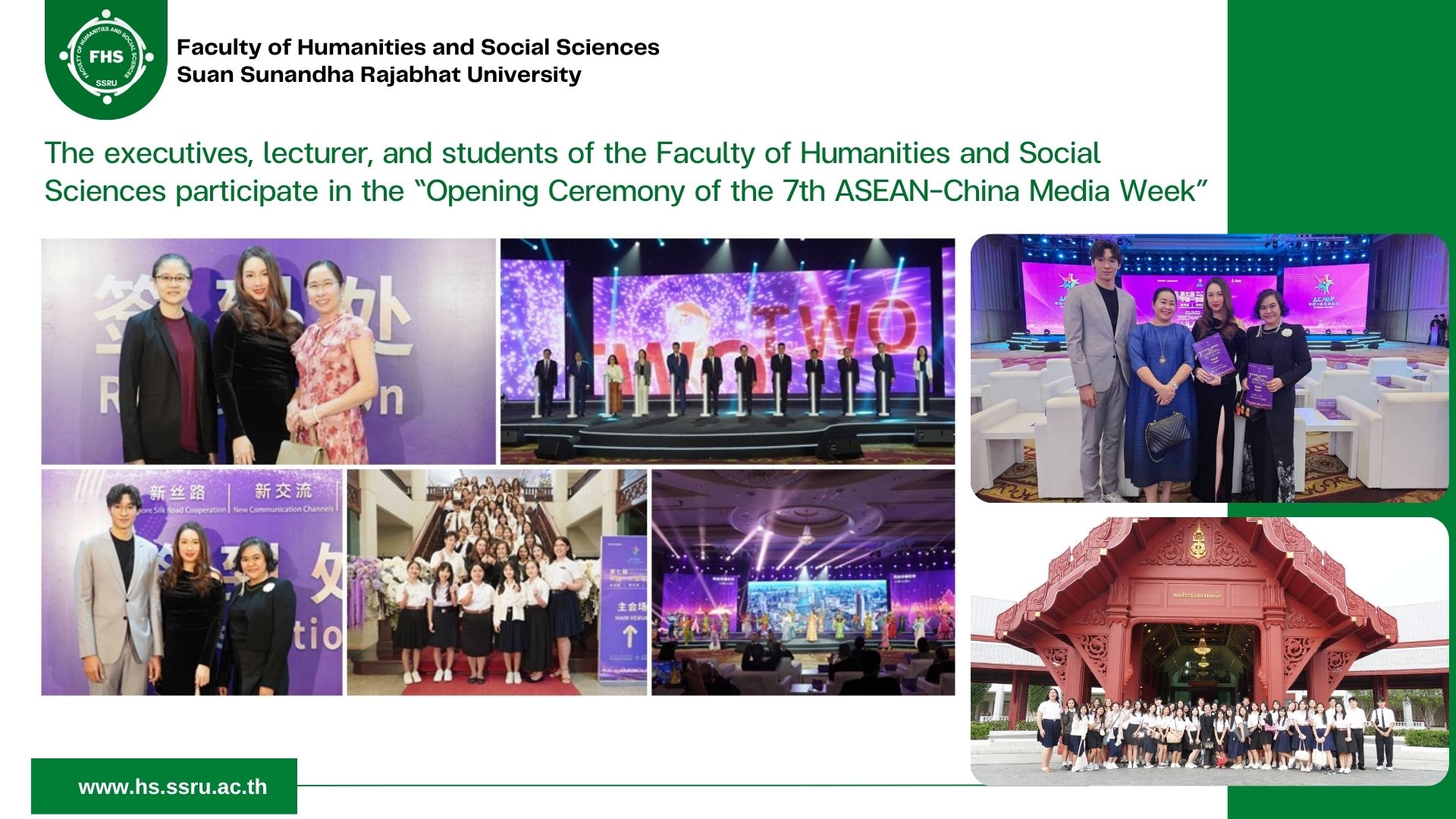 June 26, 2025, 19:00 hrs. – Dr. Napasri Suwanajote, Dean of the Faculty of Humanities and Social Sciences participated in the “Opening Ceremony of the 7th ASEAN-China Media Week” under the theme "More Silk Road Cooperation, New Chapter Communication, Innovative Media Approach", the initiative aims to strengthen Thailand–China relations through creative media collaboration. It also seeks to foster the development of robust China–ASEAN media cooperation, promoting engagement between the people and government agencies of both Thailand and China. The event is organized by the Thai Ministry of Culture and the Thai Media Fund, in collaboration with the China Media Group (CMG) and the People's Government of Guangxi Zhuang Autonomous Region., together with Ms. Anchana Thongyai Na Ayudhya (Managing Director of Thai Society Co., Ltd.), Asst. Prof. Dr. Chutima Maneewattana (Assistant to the President for Academic Affairs), Aj. Luo Yun (Chinese Program lecturer), and students of the Chinese Program and the Business English Program, participated at the Royal Thai Navy Convention Center.