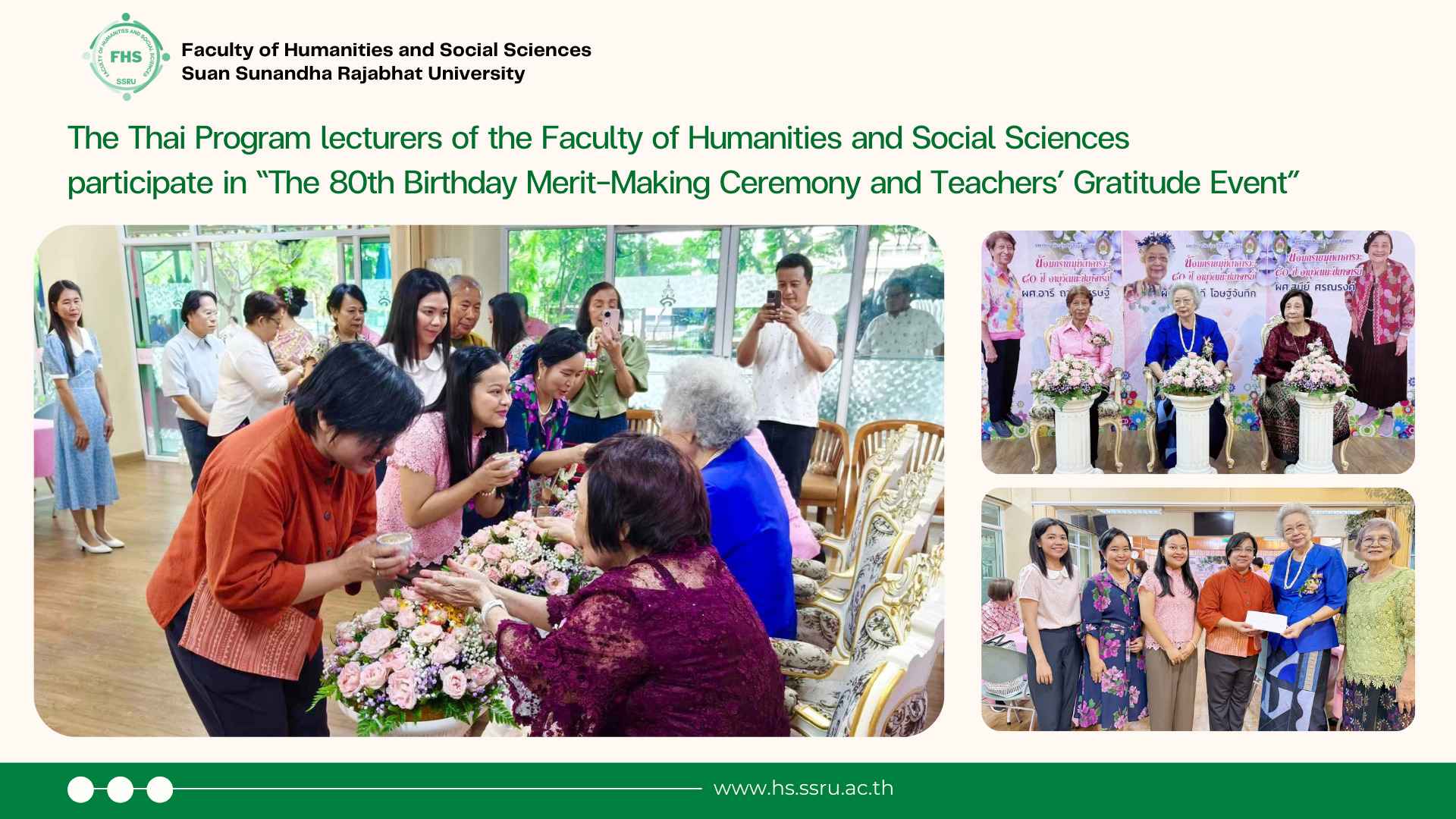 The event featured a variety of activities, including a merit-making ceremony for the 80th birthday celebration, a traditional Thai poetic performance (sepha) by Asst. Prof. Dr. Apirak Anaman, a sharing of cherished memories by Asst. Prof. Tipawan Nakasuwan, as well as performances by both alumni and current students dedicated to their beloved lecturers, and a traditional water-pouring ceremony, at the Saisawaleepirom Room, Demonstration School of Suan Sunandha Rajabhat University (Primary School).