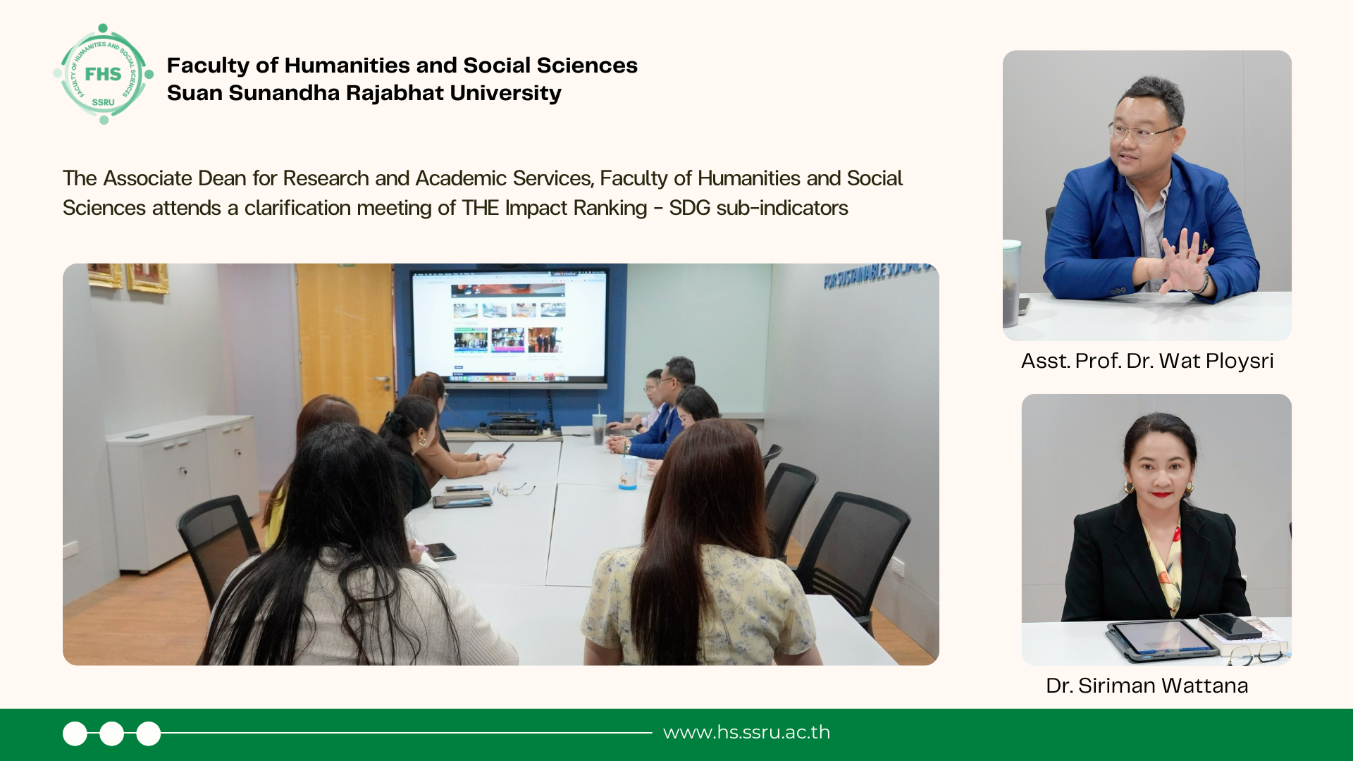 April 21, 2025, 9:30 hrs. – Dr. Siriman Wattana, Associate Dean for Research and Academic Services, Faculty of Humanities and Social Sciences attended a clarification meeting of THE Impact Rankings – SDGs sub-indicators to prepare data for the 2026 SDG performance report, at Room 3144, Building 31, 4 Fl., Suan Sunandha Rajabhat University.