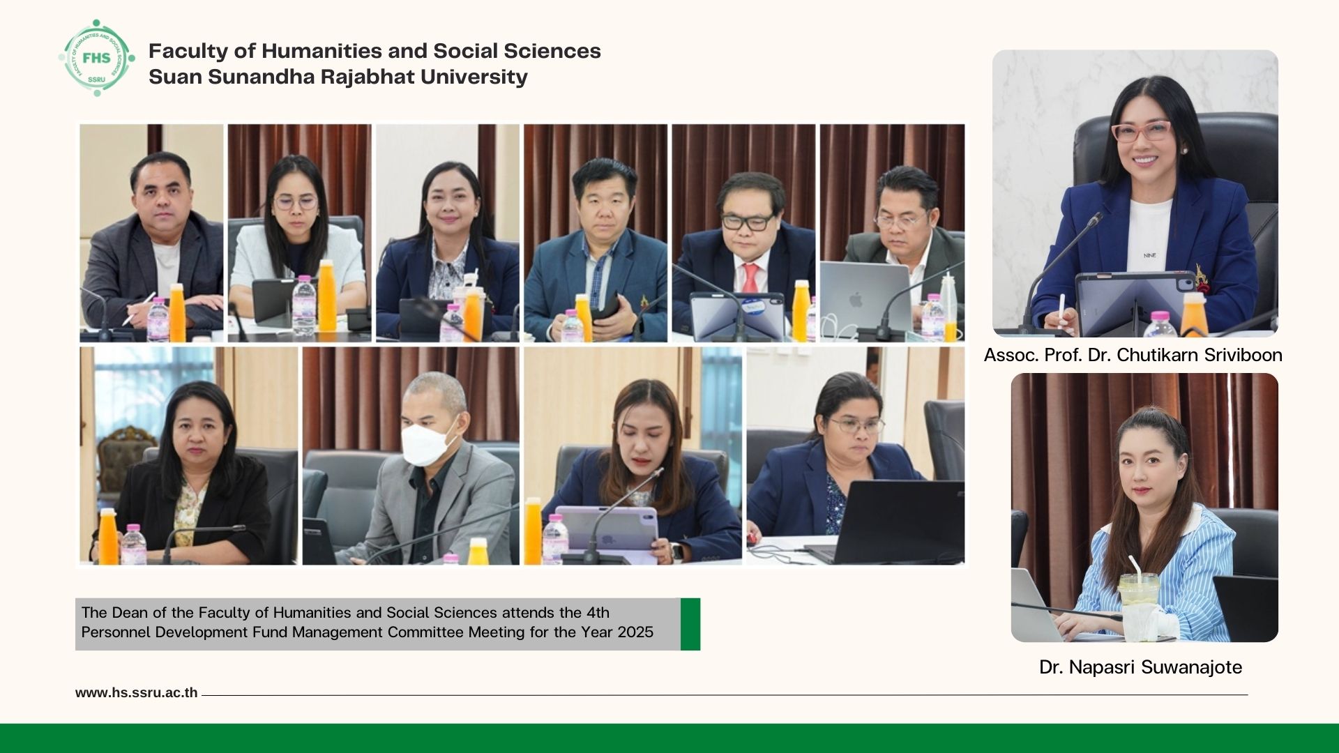 April 23, 2025, 13:00 hrs. – Dr. Napasri Suwanajote, Dean of the Faculty of Humanities and Social Sciences attended the 4th Personnel Development Fund Management Committee Meeting for the Year 2025, hosted by the Personnel Management Division, where Assoc. Prof. Dr. Chutikarn Sriviboon, President was the chair is the chair at the Office of the President’s Meeting Room, 5 Fl., Building 32, Suan Sunandha Rajabhat University.