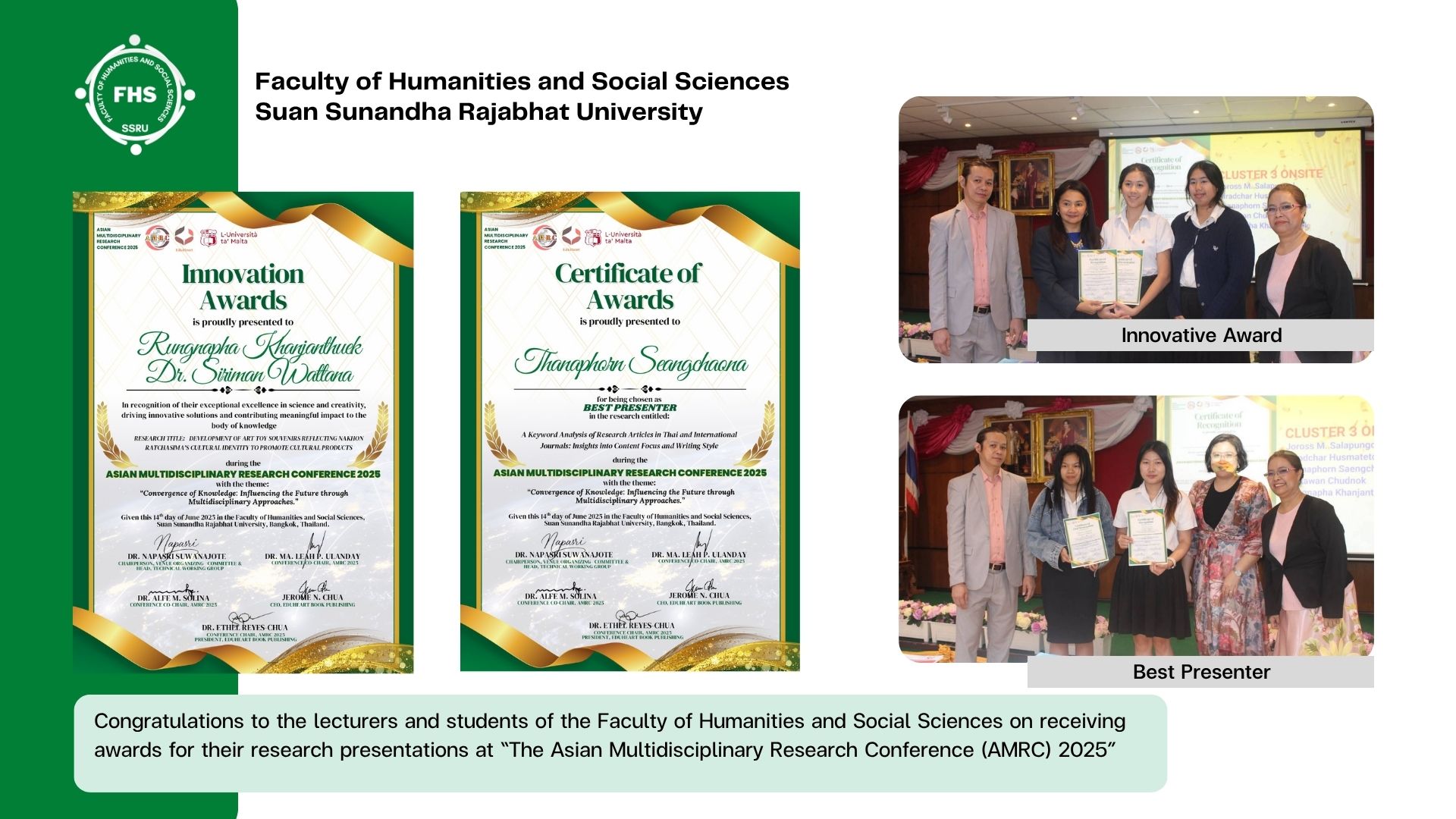 The Faculty of Humanities and Social Sciences extended congratulations to the lecturers and students on receiving awards for their research presentations at “The Asian Multidisciplinary Research Conference (AMRC) 2025”