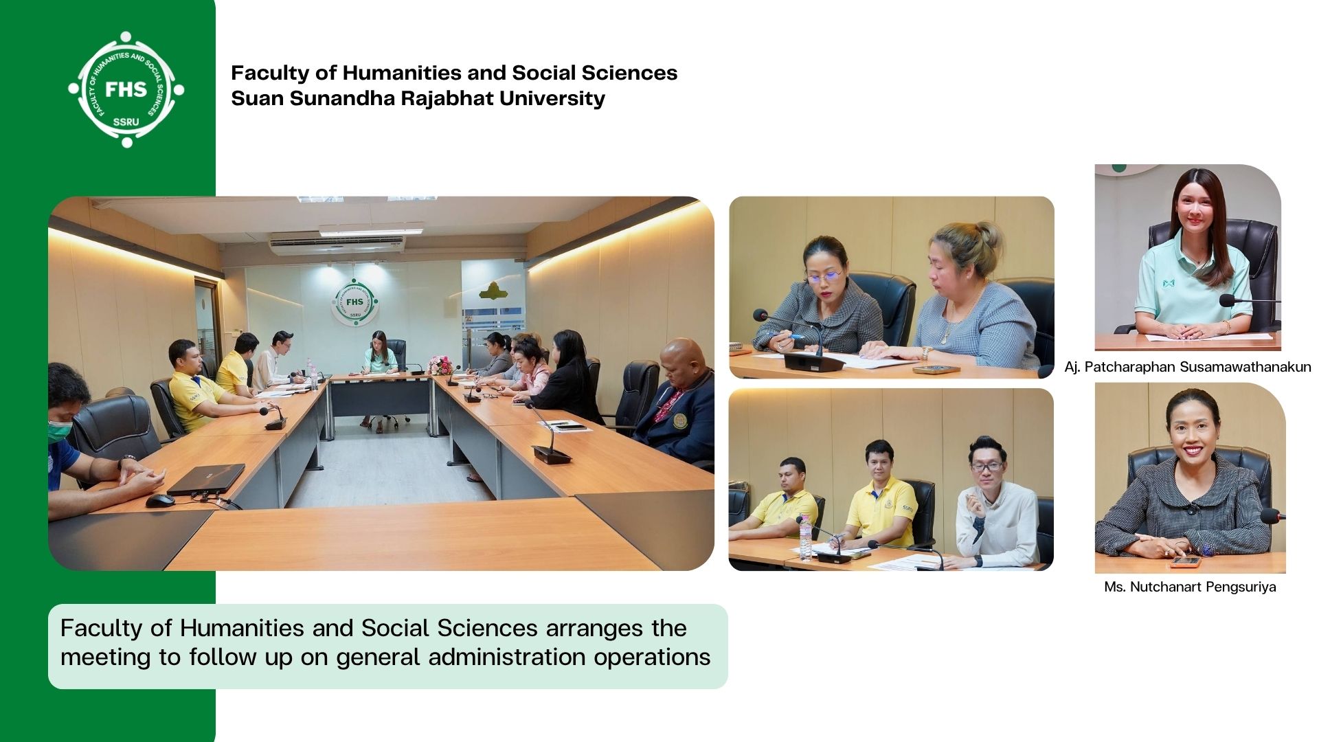 May 26, 2025, 10:30 hrs. - The General Administration Division of the Faculty of Humanities and Social Sciences arranged the meeting to follow up on general administration operations, where Aj. Patcharaphan Susamawathanakun, Associate Dean for Administration, was the chair, to monitor the progress of key performance indicators under the division’s responsibility and ensure that targets are achieved, together with Ms. Nuchanart Pengsuriya, Acting Head of the Office, and staff of the General Administration Division and the Finance and Supplies Division attended at Pornsopin Meeting Room, 1 Fl., Building 35, Faculty of Humanities and Social Sciences, Suan Sunandha Rajabhat University.
