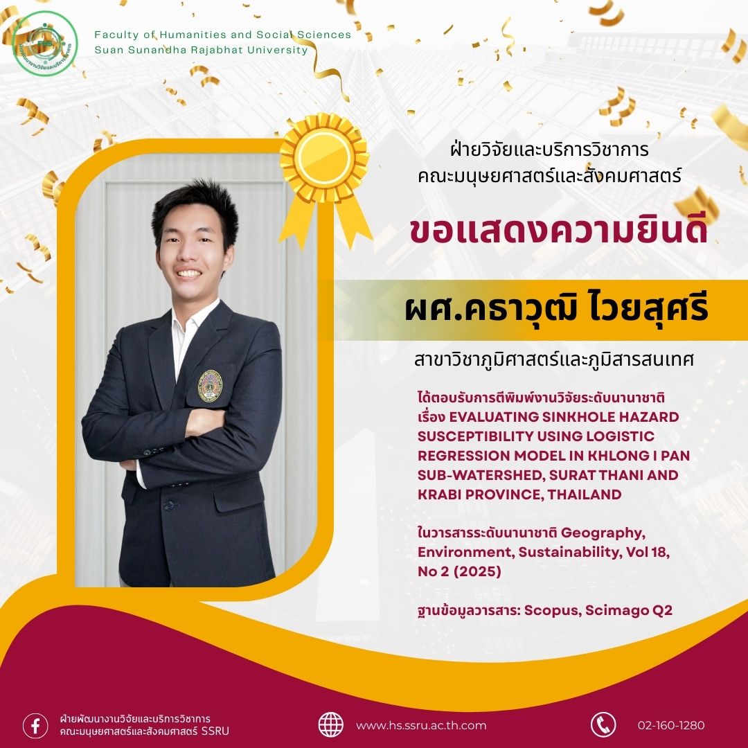 The Faculty of Humanities and Social Sciences extends congratulations to Asst. Prof. Kathawut Waiyasusri, lecturer of the Geography and Geo-informatics Program, Faculty of Humanities and Social Sciences, Suan Sunandha Rajabhat University, on his research publication titled, “EVALUATING SINKHOLE HAZARD SUSCEPTIBILITY USING LOGISTIC REGRESSION MODEL IN KHLONG I PAN SUB-WATERSHED, SURAT THANI AND KRABI PROVINCE, THAILAND”