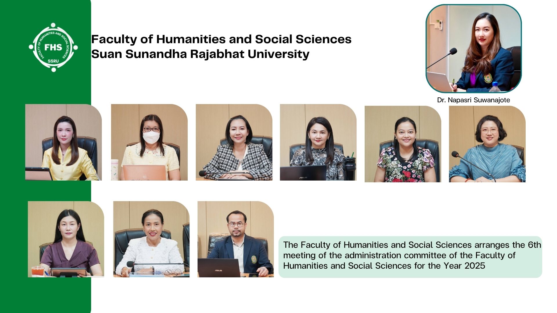 June 9, 2025 – Dr. Napasri Suwanajote, Dean of the Faculty of Humanities and Social Sciences presided over the 6th meeting of the administration committee of the Faculty of Humanities and Social Sciences for the Year 2025 to monitor the performance with the Associate Deans, Heads of the Department, Acting-Head of the Office, and Planning and Quality Assurance Division at Pornsopin Meeting Room, 1 Fl., Building 35, Faculty of Humanities and Social Sciences, Suan Sunandha Rajabhat University.