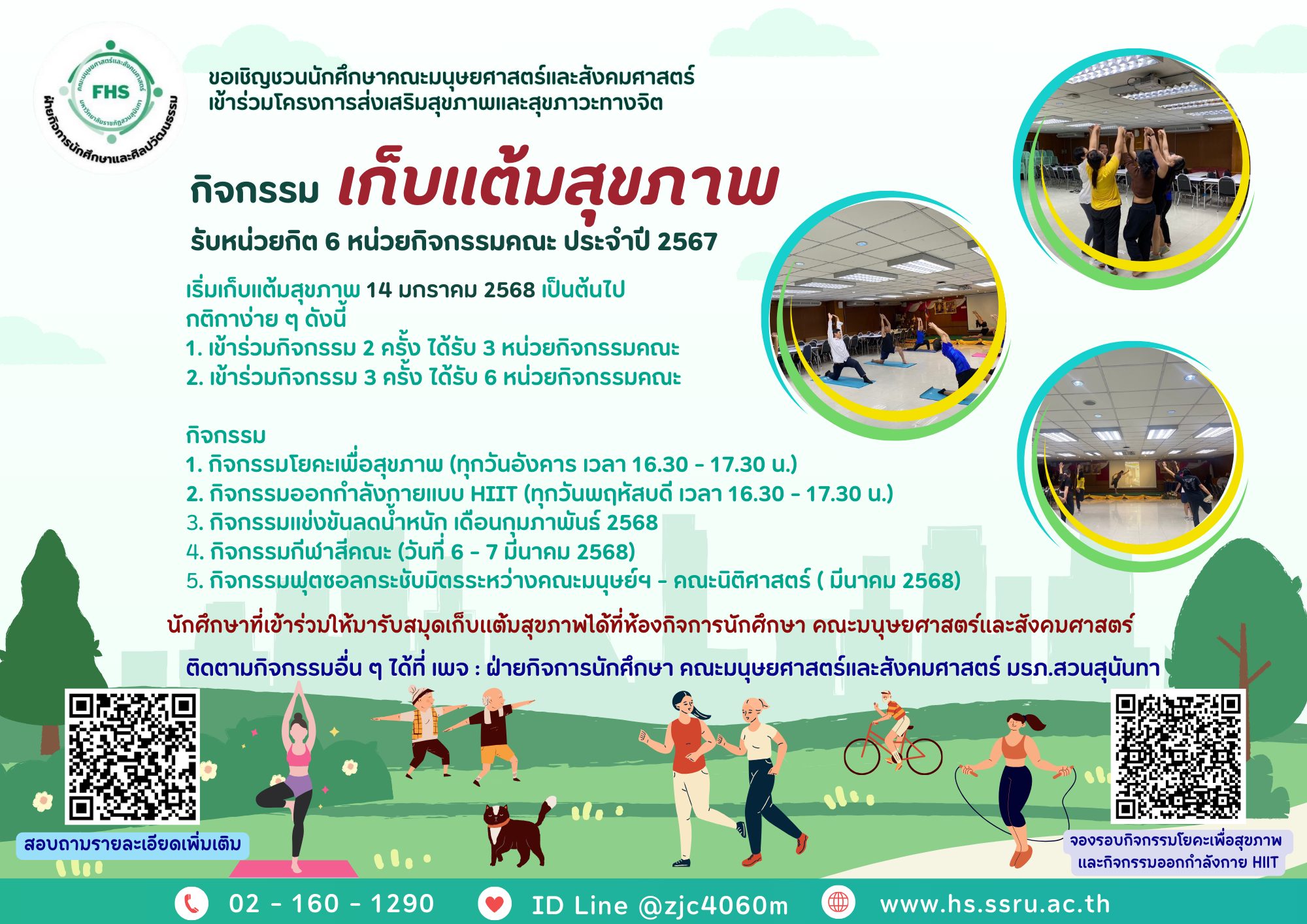 The Student Affairs Division of the Faculty of Humanities and Social Sciences, Suan Sunandha Rajabhat University invites students of the Faculty of Humanities and Social Sciences to participate in the Health and Mental Well-Being Promotion Project for the Academic Year 2024 under the activity "Health Points Collection", earning 6 faculty activity credits and starting on January 14, 2025