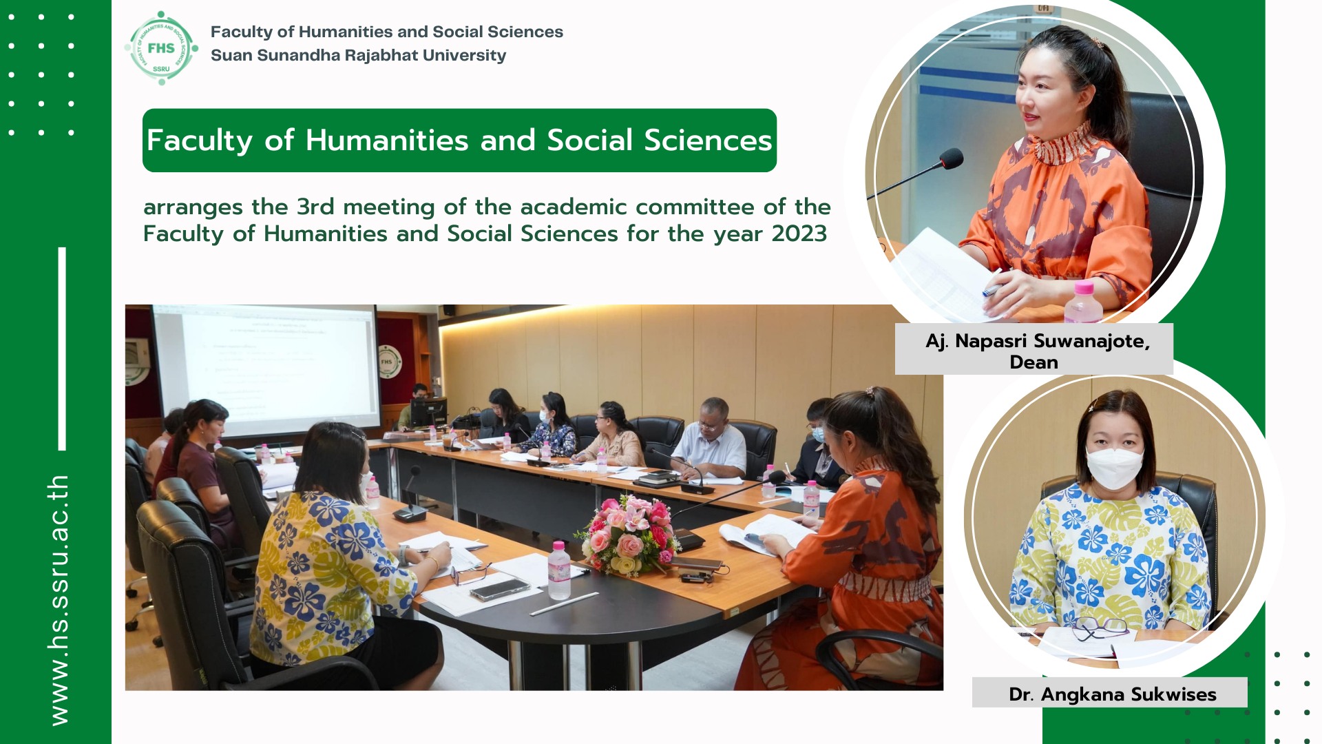 November 14, 2023 – Aj. Napasri Suwanajote, Dean of the Faculty of Humanities and Social Sciences presided over the 3rd meeting of the academic committee of the Faculty of Humanities and Social Sciences for the year 2023, including Dr. Angkana Sukwises, Associate Dean for Academic Affairs, heads of the department, heads of the program, and the relevant staff to monitor the academic performance of the Faculty of Humanities and Social Sciences at Pornsopin Meeting Room, 1 Fl., Building 35.