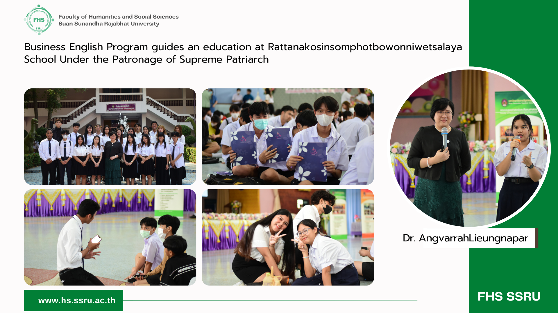 February 14, 2024 - Dr. Angvarrah Lieungnapar, and students conducted educational education on the curriculum of the Faculty of Humanities and Social Sciences for students of Rattanakosinsomphotbowonniwetsalaya School Under the Patronage of Supreme Patriarch, Salaya Subdistrict, Phutthamonthon District Nakhon Pathom Province.