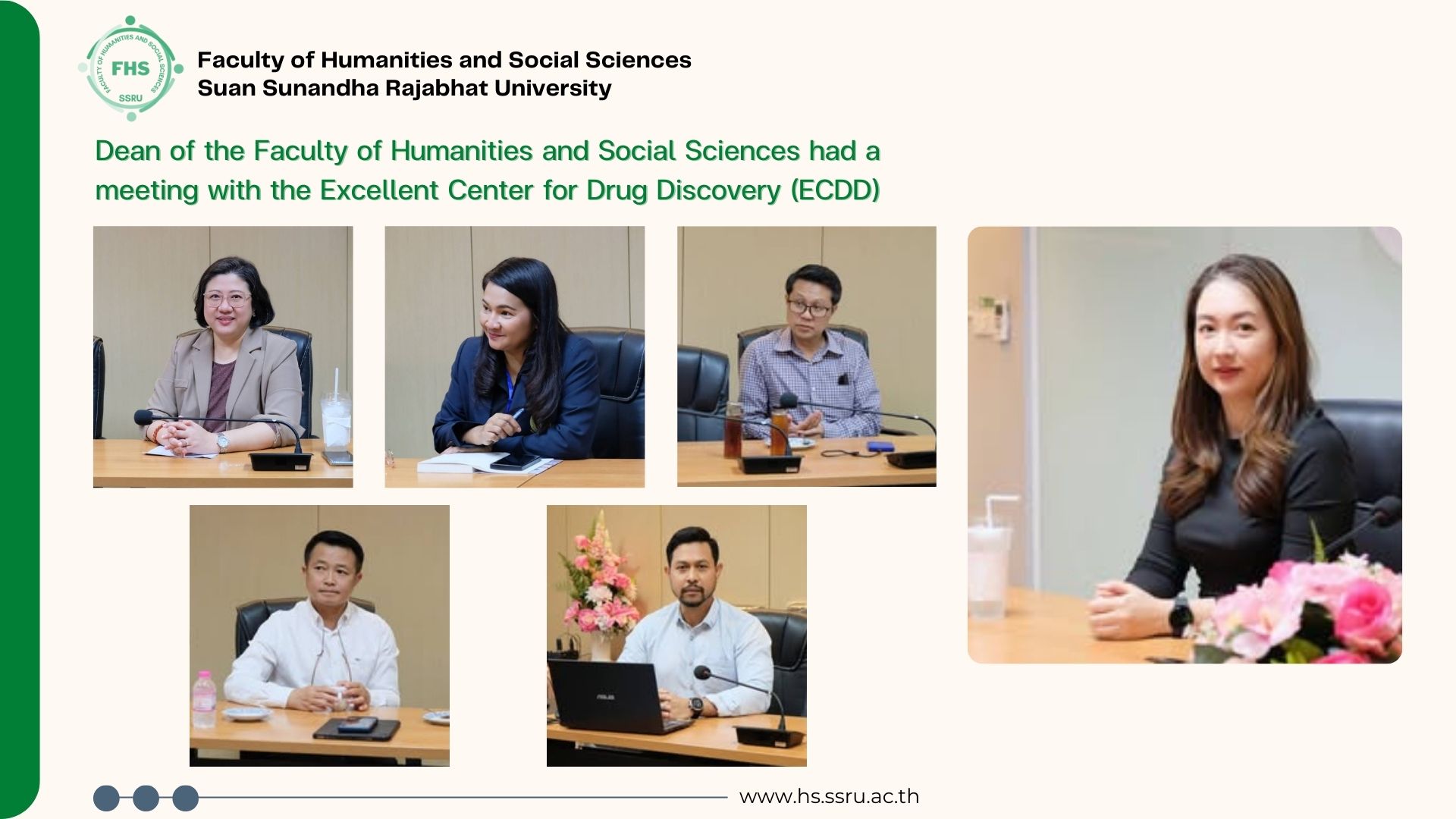 March 22, 2025, 10:00 hrs. - Dr. Napasri Suwanajote, Dean of the Faculty of Humanities and Social Sciences had a meeting with the Excellent Center for Drug Discovery (ECDD) led by Dr. Suparerk Borwornpinyo, Director, together with Dr. Angvarrah Lieungnapar (Associate Dean for Business Development and Revenue Generation), Dr. Siriman Wattana (Associate Dean for Research and Academic Services, and Mr. Wuttipong Niemboon (Computer Technical Officer, Professional Level) attended at Pornsopin Meeting Room, 1 Fl., Building 35, Faculty of Humanities and Social Sciences, Suan Sunandha Rajabhat University.