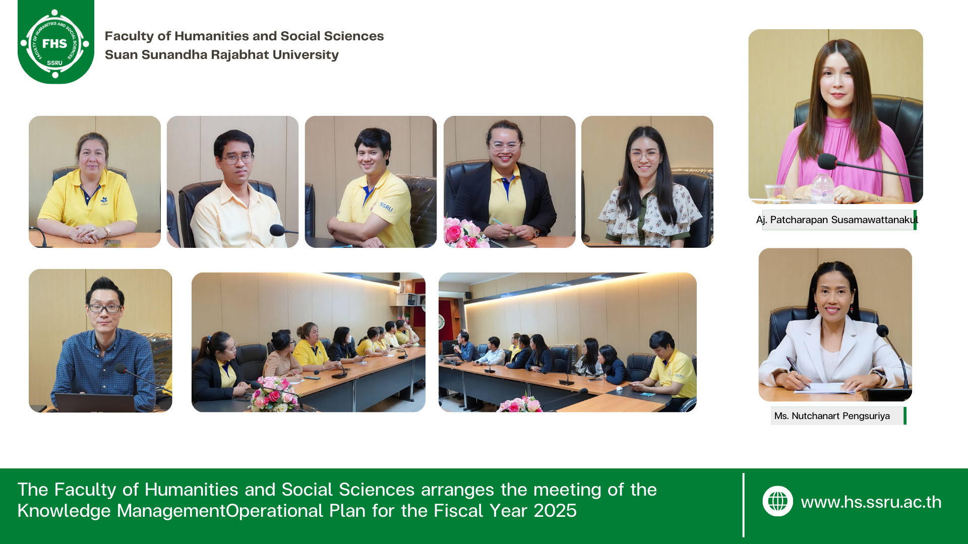 November 19, 2024 - The Faculty of Humanities and Social Sciences, Suan Sunandha Rajabhat University arranged the meeting of the Knowledge Management Operational Plan for the Fiscal Year 2025 (non-academic staff) to define the roles and responsibilities of the members including planning the operational plan, where Aj. Patcharapan Susamawattanakul, Associate Dean for Administration, Ms. Nutchanart Pengsuriya, Acting-Head of the Office, head of the division, and non-academic staff attended at Pornsopin Meeting Room, 1 Fl., Faculty of Humanities and Social Sciences, Suan Sunandha Rajabhat University.