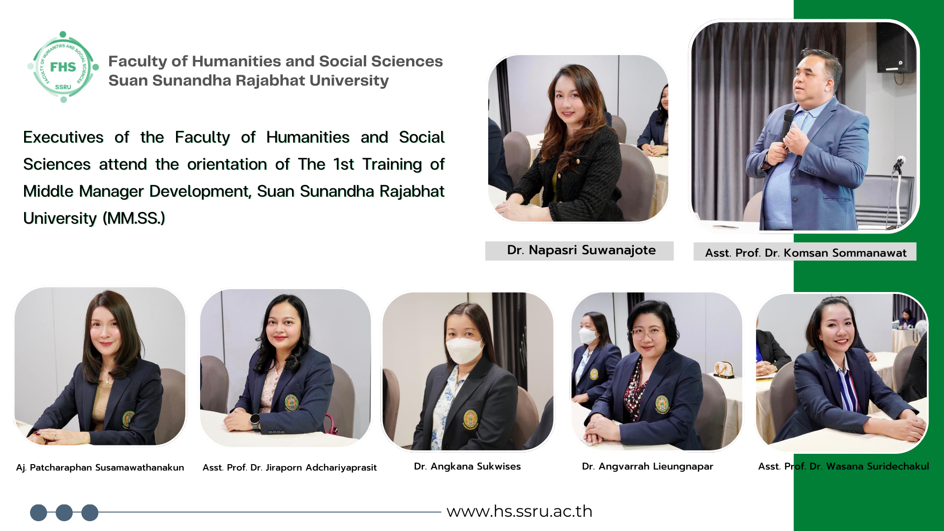 June 21, 2024 – Dr. Napasri Suwanajote, Dean of the Faculty of Humanities and Social Sciences attended the orientation of The 1st Training of Middle Manager Development, Suan Sunandha Rajabhat University (MM.SS.), hosted by the Personnel Management Division, where Asst. Prof. Dr. Komsan Sommanawat, Vice President for Administration is the chair, together with the executives of the Faculty of Humanities and Social Sciences; Aj. Patcharaphan Susamawathanakun (Associate Dean for Administration), Dr. Angkana Sukwises (Associate Dean for Academic Affairs), Dr. Angvarrah Lieungnapar (Associate Dean for Research and Academic Services), Asst. Prof. Dr. Wasana Suridechakul (Associate Dean for Planning and Quality Assurance), and Asst. Prof. Dr. Jiraporn Adchariyaprasit (Associate Dean for Student Affairs) attended at Room 5724, 2 Fl., Faculty of Management Sciences.