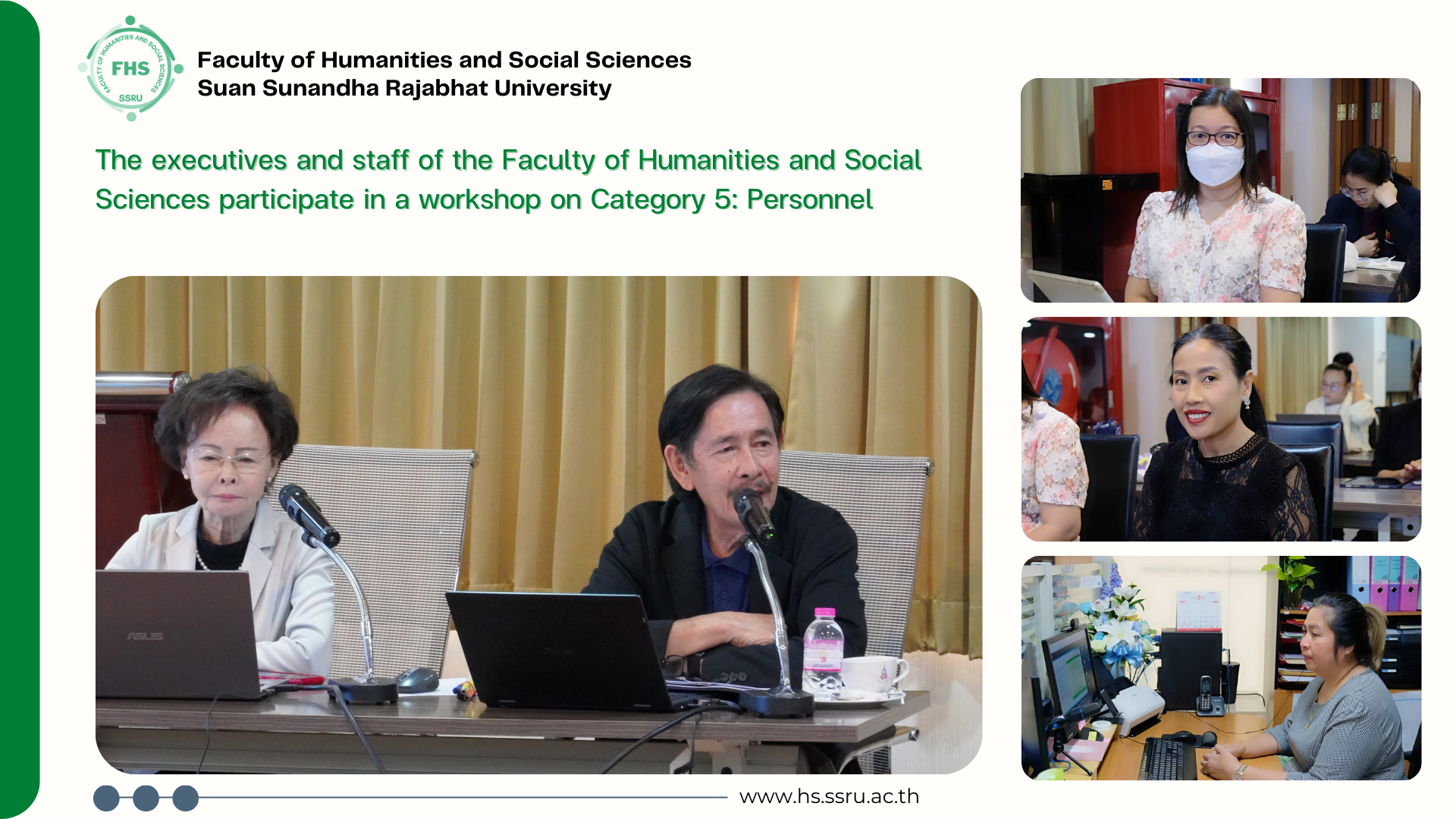 February 28, 2025 - Dr. Aungkana Sukwises, Associate Dean for Academic Affairs of the Faculty of Humanities and Social Sciences, together with Ms. Nutchanart Pengsuriya, Acting-Head of the Office, participated in a workshop on Category 5: Personnel, “analyzing details of Strength & OFI (Opportunities for Improvement) and related outcome categories, prioritizing areas for improvement, and recommending enhancement strategies using Quality Work Processes (QWP) to enhance the development of SSRU” at the institutional level, organized by the Personnel Administration Division, at the Audiovisual Conference Room, 4th Floor, Building 33, Suan Sunandha Rajabhat University. Additionally, Ms. Toonlada Phetampai, Head of the Administration Division attended the training session via Google Meet.