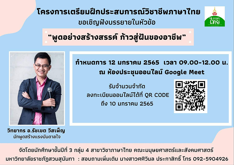 The Thai language program would like to invite interesting people to attend the lecture which is a part of the Project to Prepare for Professional Practice Experience in Thai by Ajarn Ratchakhet Wiespen as a speaker. The topic is “Creative Speaking: Step for the Career in Your Dream” on January 12, 2022, from 9:00 a.m. to 12:00 a.m. via the online meeting room system: Google Meet. Those interested in attending can sign up via QR code within January 10, 2022.