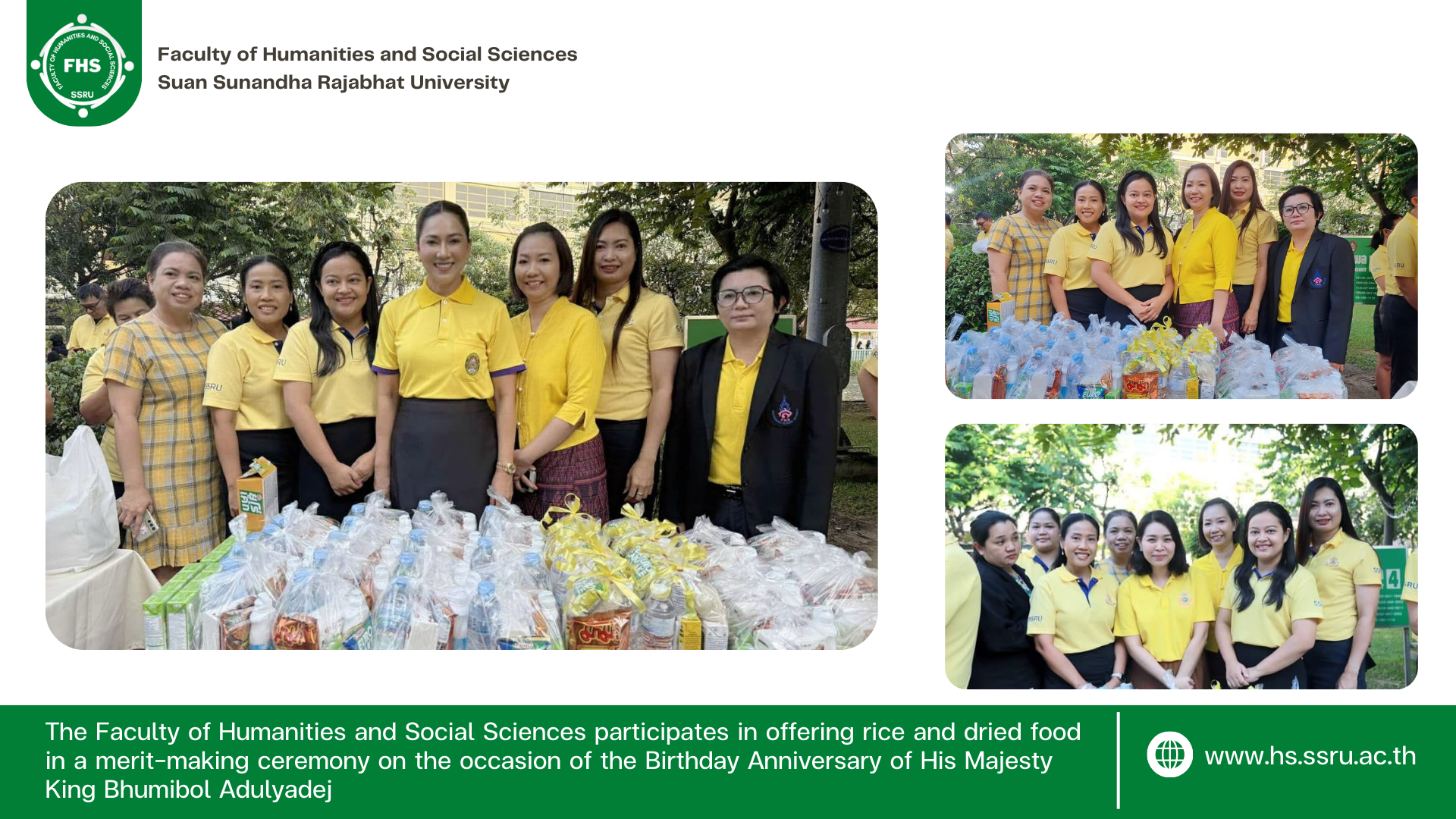 December 4, 2024 - Asst. Prof. Dr. Jiraporn Adchariyaprasit, Associate Dean for Student Affairs, together with Asst. Prof. Dr. Wasana Suridechakul (Associate Dean for Planning and Quality Assurance), Aj. Pailin Klinkesorn (Head of the Humanities Department), Ms. Nutchanart Pengsuriya (Acting head of the Office), and staff of the Faculty of Humanities and Social Sciences participated in offering rice and dried food in a merit-making ceremony on the occasion of the Birthday Anniversary of His Majesty King Bhumibol Adulyadej in front of the Office of the President Building, 1 Fl, Suan Sunandha Rajabhat University.