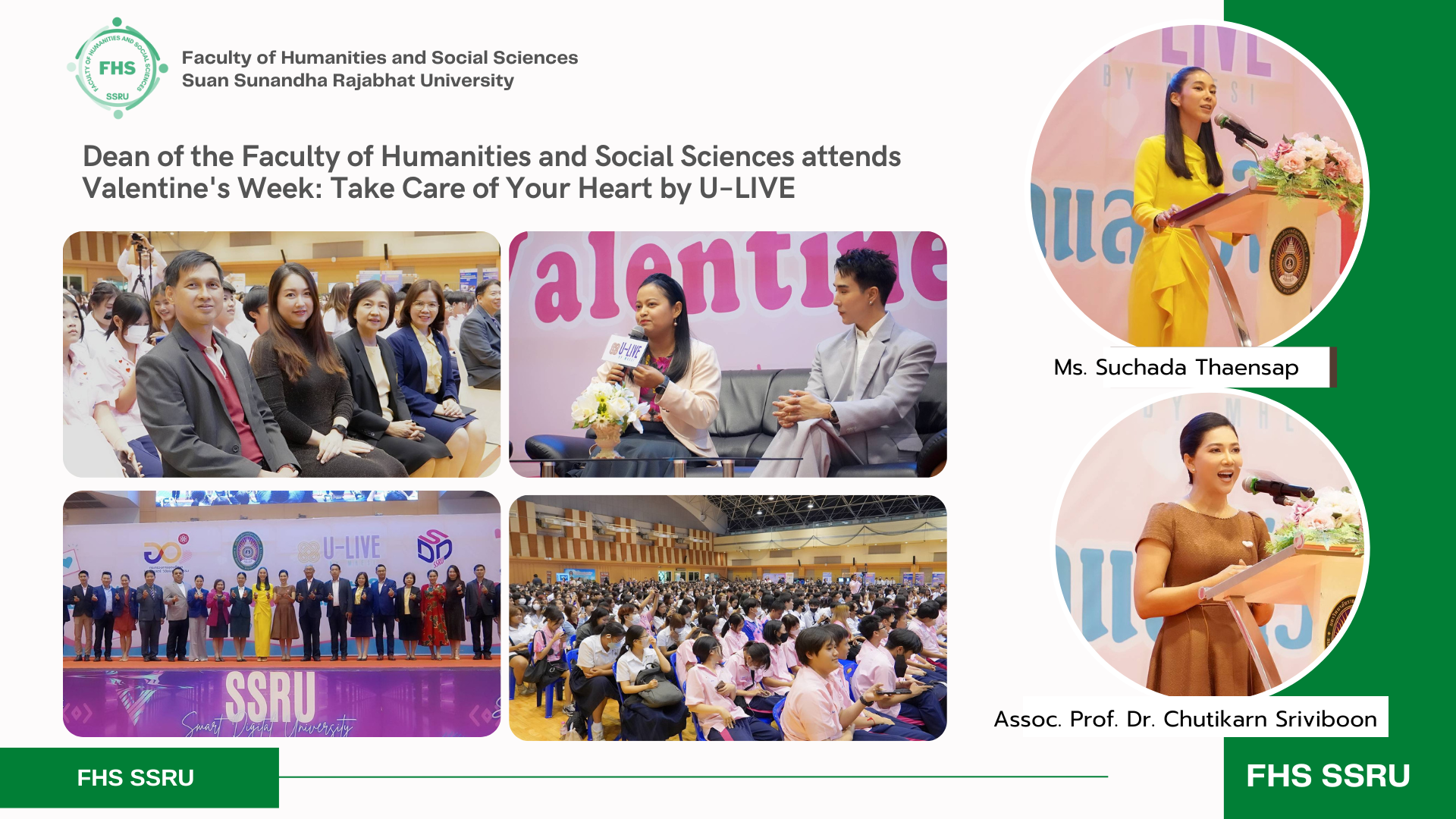 February 14, 2024 – Dr. Napasri Suwanajote, Dean of the Faculty of Humanities and Social Sciences attended Valentine's Week: Take Care of Your Heart by U–LIVE, hosted by the Student Development Division, where Ms. Suchada Thaensap, Secretary to the Minister of Higher Education, Science, Research and Innovation is the chair and Assoc. Prof. Dr. Chutikarn Sriviboon, President extends a warm welcome and delivers a speech. This event arranges the seminar, “MIND & LOVE” by Khun Pattaradanai Setsuwan (KOEN K-OTIC), artist and psychotherapist who inspired the positive living, and Asst. Prof. Dr. Jiraporn Adchariyaprasit, Associate Dean for Student Affairs at the Health and Sports Center Building, 4 Fl.