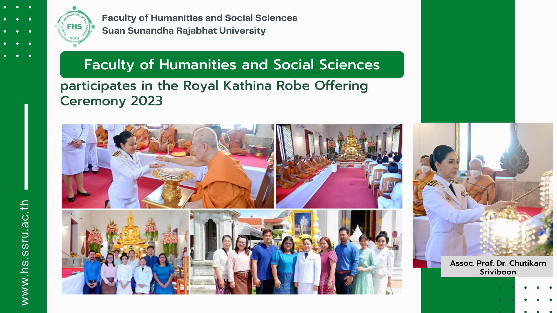 November 14, 2023 – Asst. Prof. Dr. Jiraporn Adchariyaprasit, Associate Dean for Student Affairs, and staff of the Faculty of Humanities and Social Sciences participated in the Royal Kathina Ceremony 2023, where Assoc. Prof. Dr. Chutikarn Sriviboon, President was the chair, together with the executives and staff of Suan Sunandha Rajabhat University offered the Royal Kathina Robe and four necessities amount of 1,594,548 baht at Wat Parinayok Worawihan, Bangkok.