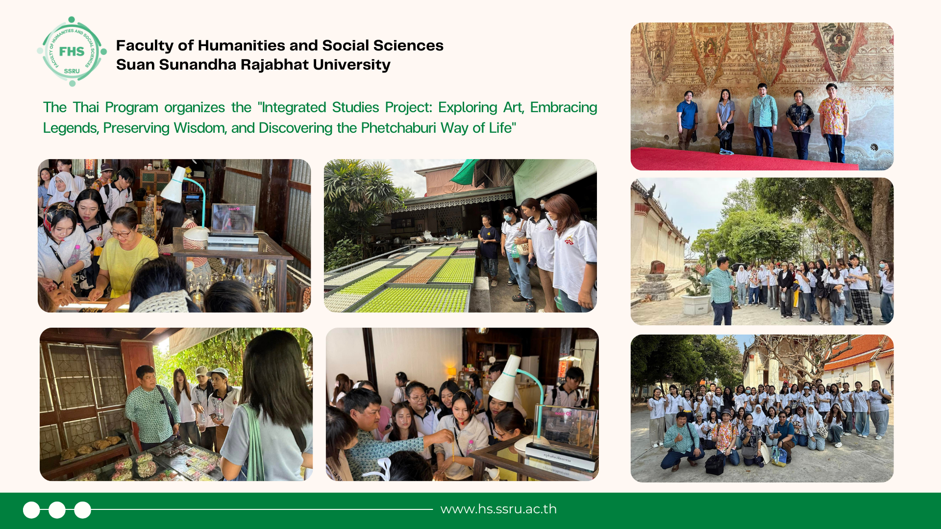 March 19–20, 2025 - The Thai Program, Department of Humanities, Faculty of Humanities and Social Sciences, Suan Sunandha Rajabhat University, organized the "Integrated Studies Project: Exploring Art, Embracing Legends, Preserving Wisdom, and Discovering the Phetchaburi Way of Life" in Phetchaburi and Prachuap Khiri Khan. The lecturers and third-year students of the Thai Program visited various learning sites in Phetchaburi, a historical area that was a thriving trade port and a cultural hub. The province is renowned for its skilled artisans in various crafts, earning it the nickname "The City of Master Craftsmen" (Sakun Chang Mueang Phet).