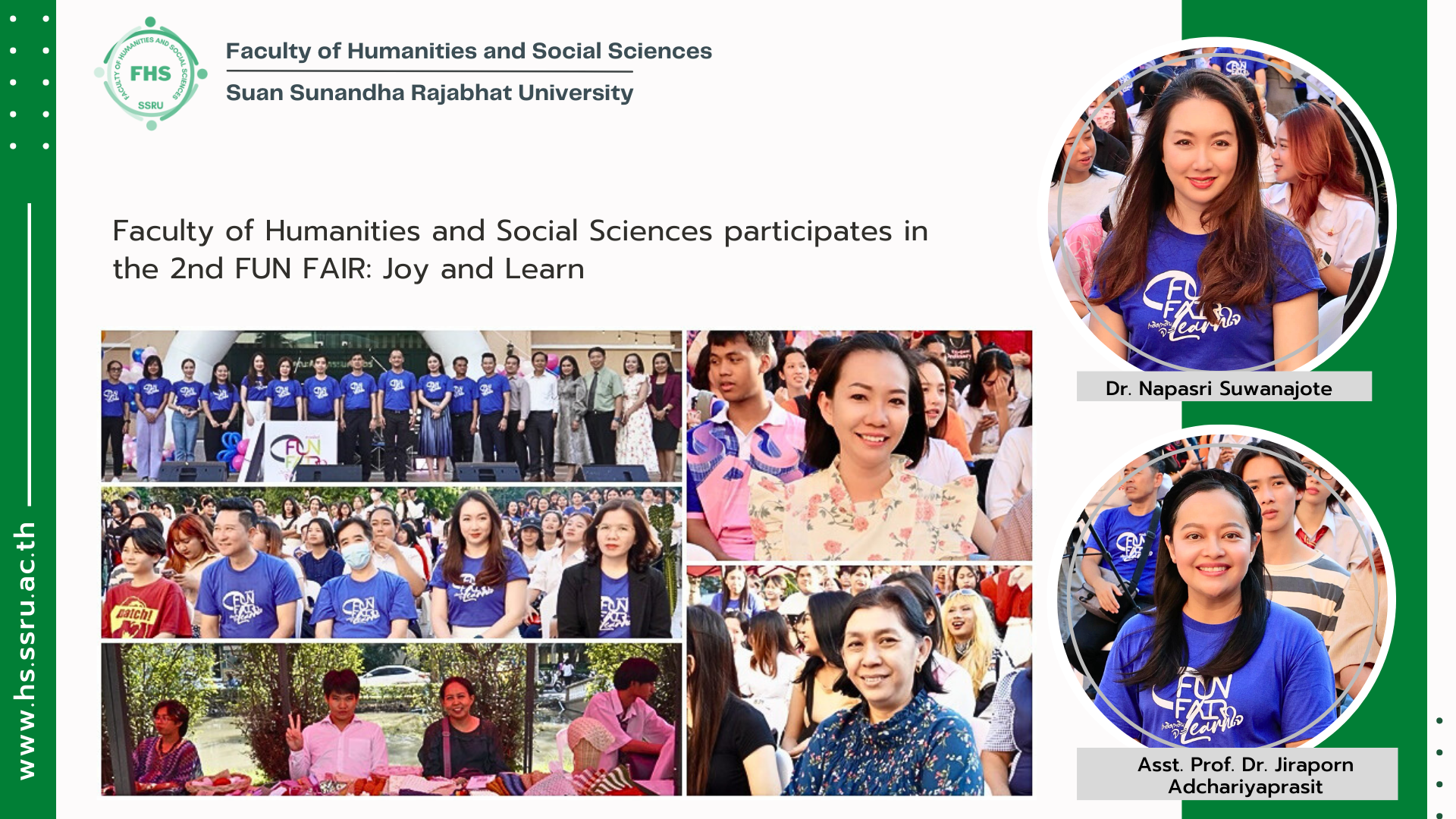 February 7, 2024 – Dr. Napasri Suwanajote, Dean of the Faculty of Humanities and Social Sciences, together with Asst. Prof. Dr. Jiraporn Adchariyaprasit (Associate Dean for Student Affairs), Asst. Prof. Dr. Wasana Suridechakul (Associate Dean for Planning and Quality Assurance), and Mrs. Onuma Chomphoonut (Acting Head of the Office) participated in the 2nd FUN FAIR: Joy and Learn at Suan Sunandha Rajabhat University. The event comprised visiting the Arts and Culture Learning Center, Creative Idea Flea Market, activities and games, and performance shows.