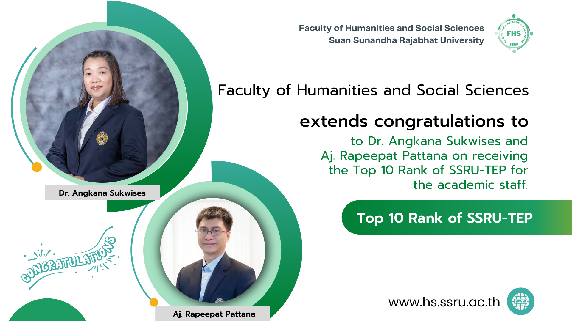 Faculty of Humanities and Social Sciences extends congratulations to Dr. Angkana Sukwises and Aj. Rapeepat Pattana on receiving the Top 10 Rank of SSRU-TEP for the academic staff.