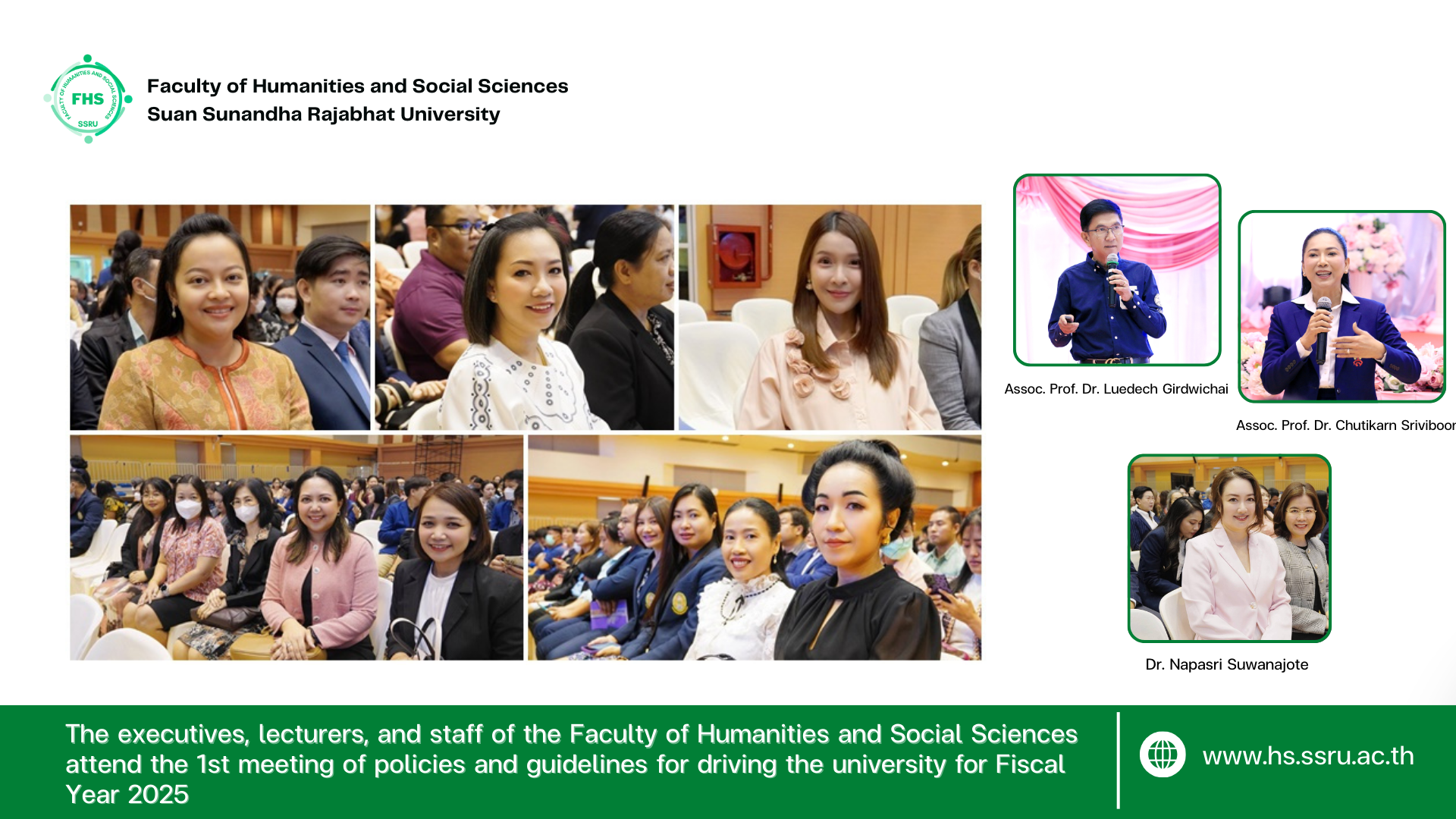 November 14, 2024, 08:30 hrs. – Dr. Napasri Suwanajote, Dean of the Faculty of Humanities and Social Sciences attended the 1st meeting of policies and guidelines for driving the university for Fiscal Year 2025, together with the associate deans, lecturers, and staff of the Faculty of Humanities and Social Sciences attended at the Health and Sport Center Building, 4 Fl., Suan Sunandha Rajabhat University, where the executives as follows;