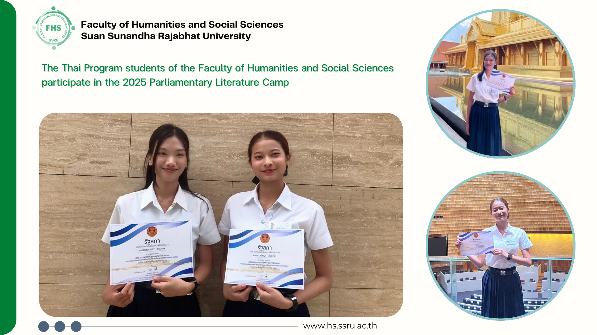 March 14, 2025 - Ms. Phutthida Rummanop and Ms. Kanya Phadungdet, second-year students of the Thai Program, Faculty of Humanities and Social Sciences, Suan Sunandha Rajabhat University, participated in the 2025 Parliamentary Literature Camp as a part of the Pan Wan Fa Literary Awards Competition at Meeting Room B1-2, B1 Floor, Parliament Building, (Kiakkai).