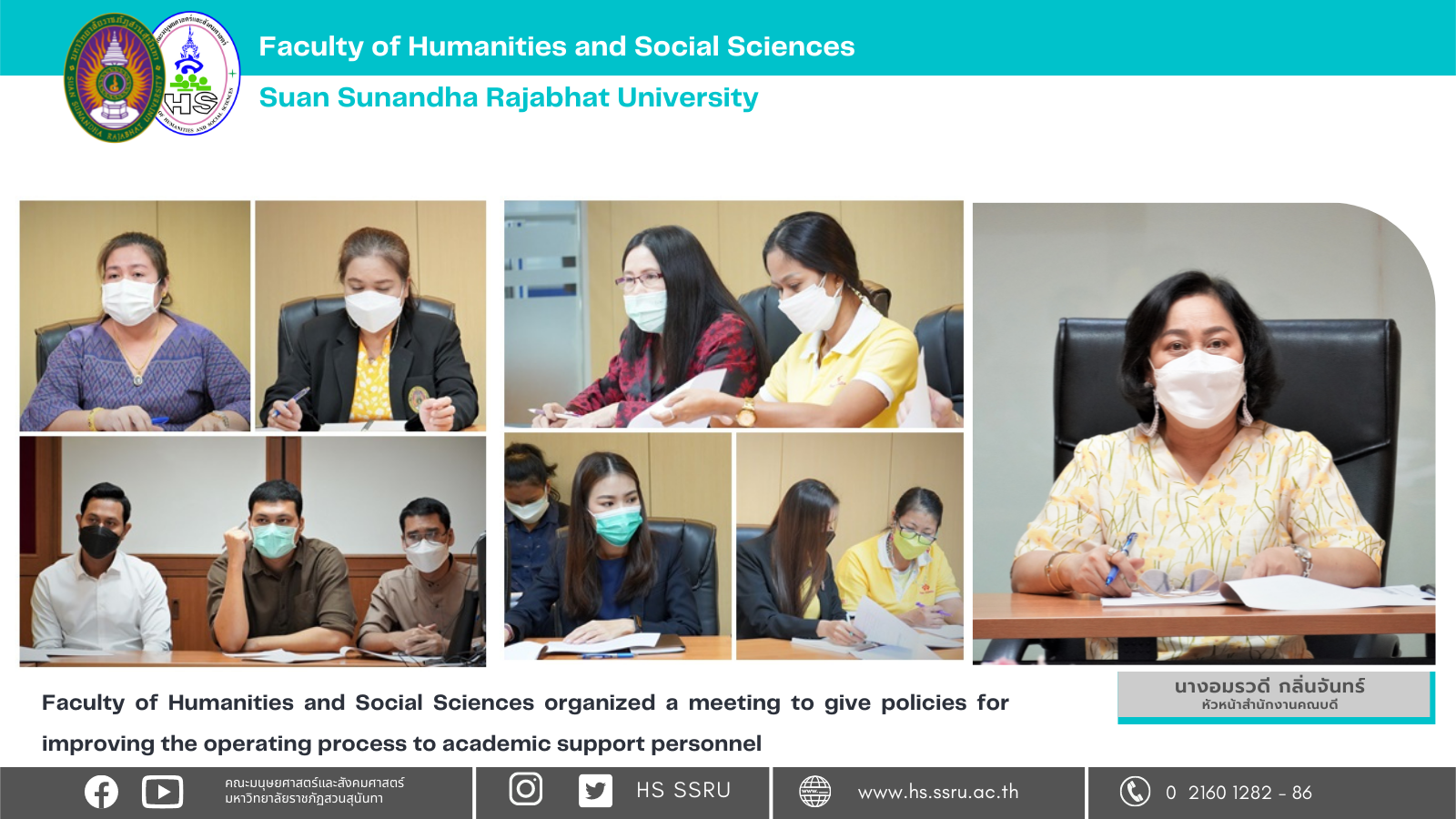 On December 20, 2021 Mrs. Amornwadee Klinchan, Head of Office of the Dean of the Faculty of Humanities and Social Sciences, chaired the academic support personnel meeting. The objective of the meeting is to provide policies and guidelines for improving the operating processes of each department. The operation will be reduced in steps, reducing time, but maintaining the highest efficiency of the operation. There were academic support personnel attended the meeting at Pornsopin Meeting Room in the Faculty of Humanities and Social Sciences.
