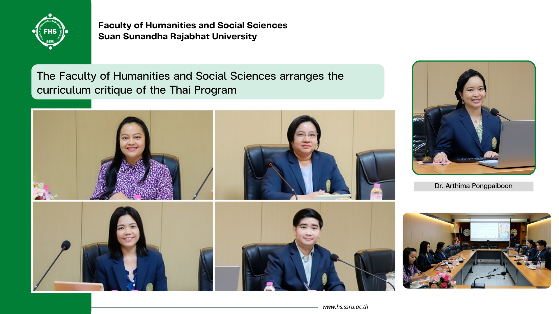 November 22, 2024, 9:00 hrs. – Dr. Arthima Pongpaiboon, Head of the Thai Program, and Thai Program lecturers of the Faculty of Humanities and Social Sciences extended a welcome to the committee through the Google Meet including Asst. Prof. Dr. Pattama Teekaprasertkul, Asst. Prof. Dr. Sureerat Bamrungsuk, and Assoc. Prof. Apirak Kasempunkul, for the curriculum critique by the Outcome–Based Education (OBE) of the Bachelor’s Degree in Thai Program at Pornsophin Meeting Room, 1 Fl., Building 35, Faculty of Humanities and Social Sciences, Suan Sunandha Rajabhat University. The revised curriculum will be implemented in the first semester of the academic year 2026.