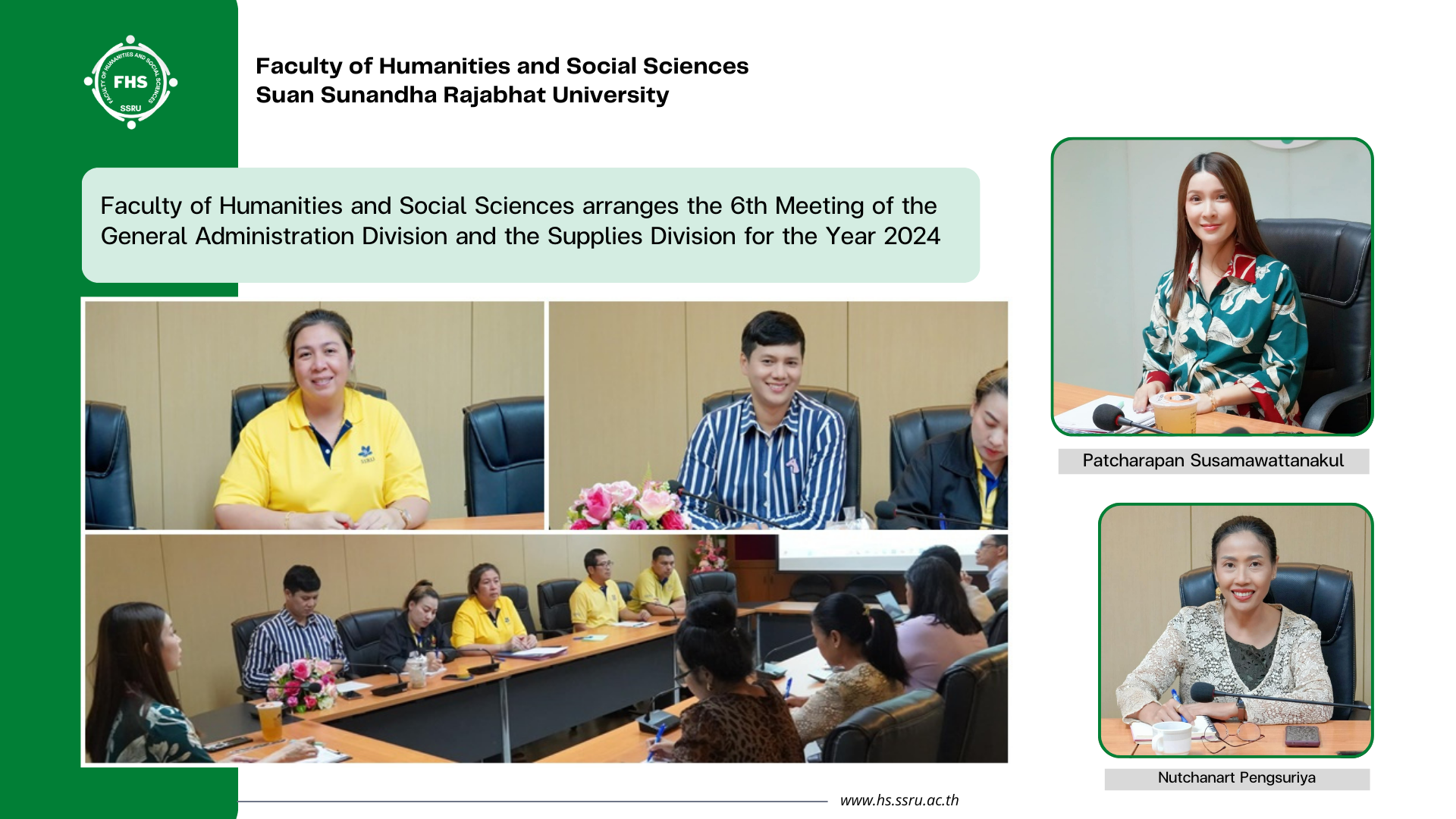 November 25, 2024, 1:00 hrs. - The Faculty of Humanities and Social Sciences, Suan Sunandha Rajabhat University arranged the 6th Meeting of the General Administration Division and the Supplies Division for the Year 2024, where Patcharapan Susamawattanakul, Associate Dean for Administration was the chair, together with Nutchanart Pengsuriya, Acting-Head of the Office, division heads, and staff of the General Administration Division and the Supplies Division attended at Pornsophin Meeting Room, 1 Fl., Building 35, Faculty of Humanities and Social Sciences, Suan Sunandha Rajabhat University.