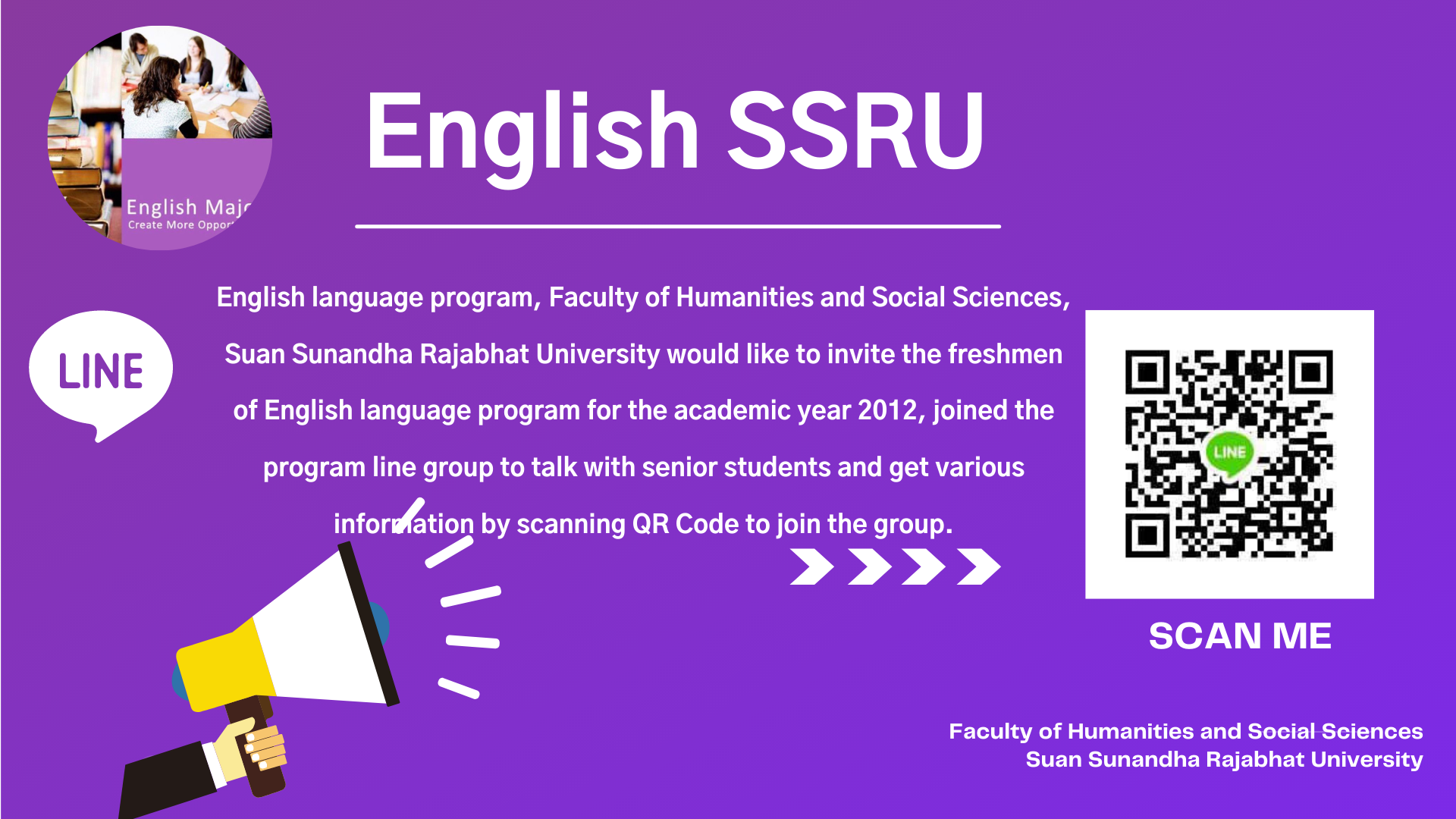 English language program, Faculty of Humanities and Social Sciences, Suan Sunandha Rajabhat University would like to invite the freshmen of English language program for the academic year 2012, joined the program line group to talk with senior students and get various information by scanning QR Code to join the group.