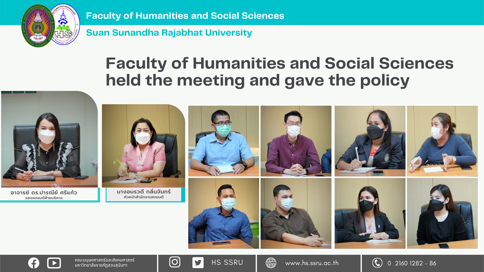 On November 23th, 2021, Dr. Paranee Srikeaw, the Vice- Dean for Administration, the Faculty of Humanities and Social Sciences, presided over the meeting of the supporting officers for the Management and Administration Section at Phornsophin conference room. Mrs. Amornvadee Klinjan, the Head office Dean joined this meeting and gave the policy for adjusting the operation for efficient jobs and conforming to the performance of the Faculty and University.