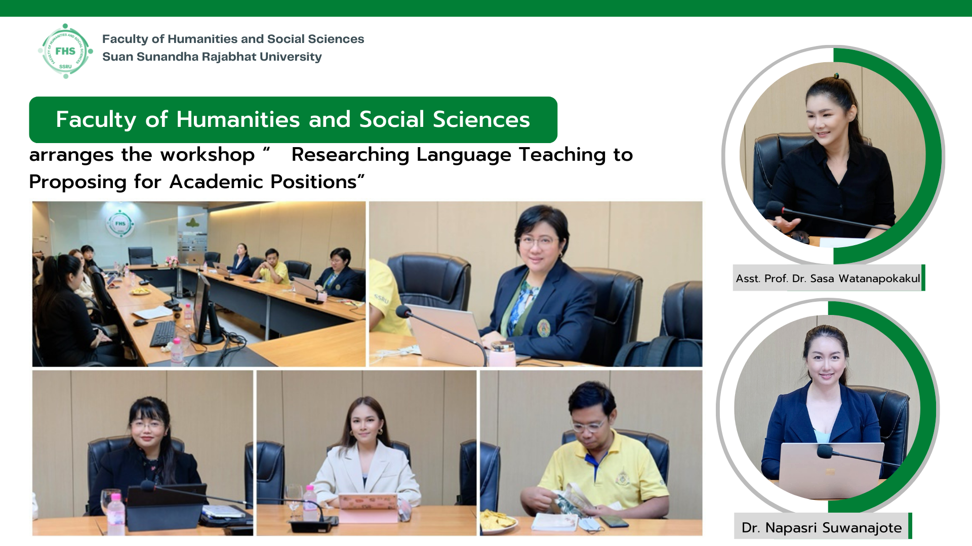 Feb 1, 2024 – Dr. Napasri Suwanajote, Dean of the Faculty of Humanities and Social Sciences attended the workshop “Researching Language Teaching to Proposing for Academic Positions”, hosted by the Business English Program of the Faculty of Humanities and Social Sciences, where it’s honored to have Asst. Prof. Dr. Sasa Watanapokakul, a lecturer of the Master of Arts in Applied Linguistics (International Program) and the Doctor of Philosophy in Applied Linguistics (International Program), Faculty of Liberal Arts, Mahidol University, and the honorable advisory committee of the Faculty of Humanities and Social Sciences as the speaker, together with Dr. Angvarrah Lieungnapar, Associate Dean for Research and Academic Services, and lecturers at Pornsopin Meeting Room, 1 Fl., Building 35.