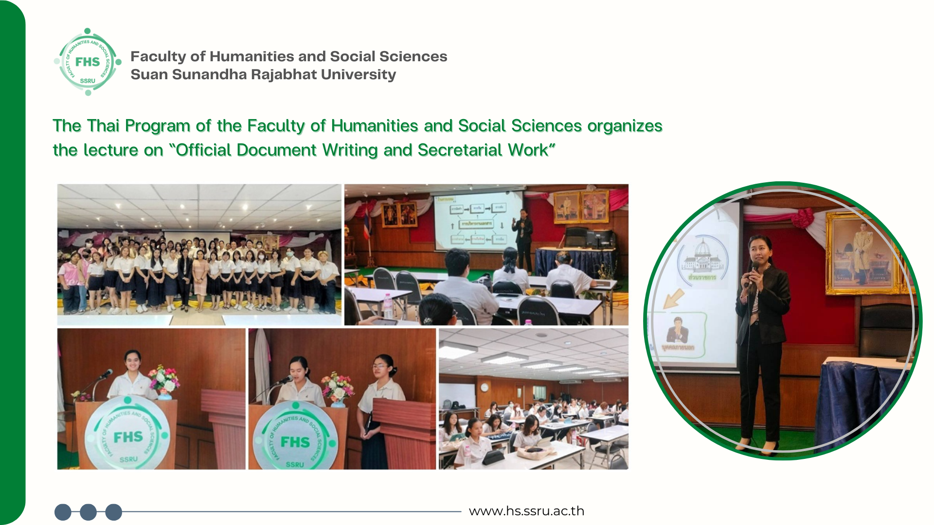 February 19, 2025, 9:00 - 12:00 hrs. - The third-year students of the Thai Program, Faculty of Humanities and Social Sciences, Suan Sunandha Rajabhat University, organized the lecture as part of their Thai Language Professional Experience Preparation course, titled “Official Document Writing and Secretatial Work”, where it was honored to have Ms. Panida Pakphitcharoen, a Senior Policy and Planning Analyst from the Office of Legal and Regulatory Affairs, Office of the Permanent Secretary, Prime Minister’s Office, as the keynote speaker.