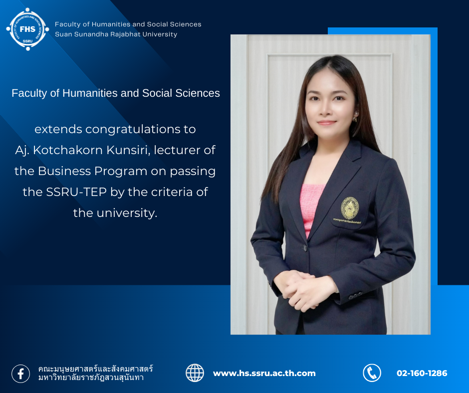 Faculty of Humanities and Social Sciences extends congratulations to Aj. Kotchakorn Kunsiri, lecturer of the Business Program on passing the SSRU-TEP by the criteria of the university.