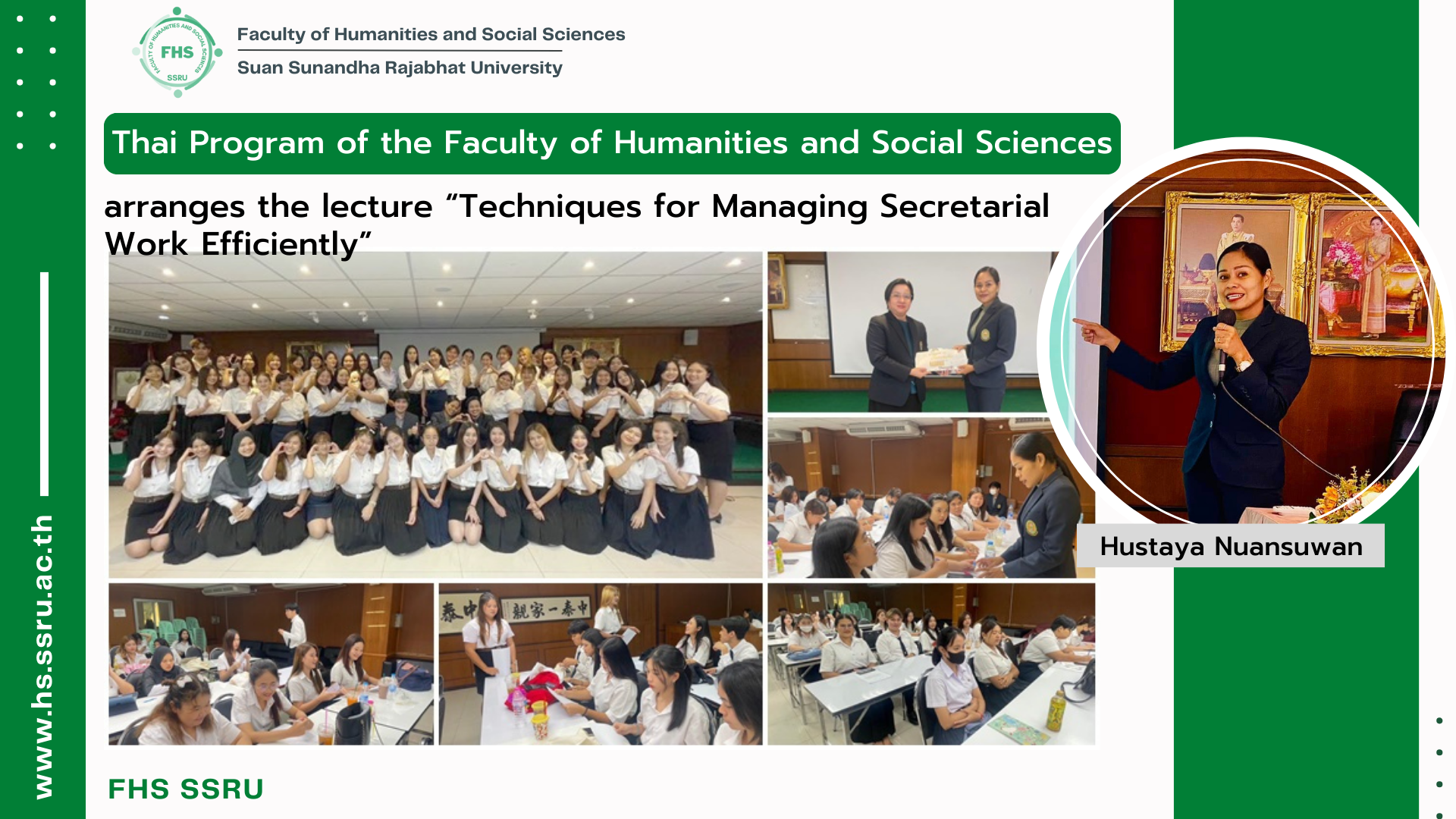 December 20, 2023 – The 3rd year students of the Thai Program, Secretarial Work Group arranged the profession preparation project, where Khun Hustaya Nuansuwan McCrimmom (P’Preaw), Administration Officer (Expert level), Department of Humanities and Department of Social Sciences, Faculty of Humanities and Social Sciences was the speaker for the lecture “Techniques for Managing Secretarial Work Efficiently” at Nipa Noppadol Meeting Room, 2 Fl., Building 35.