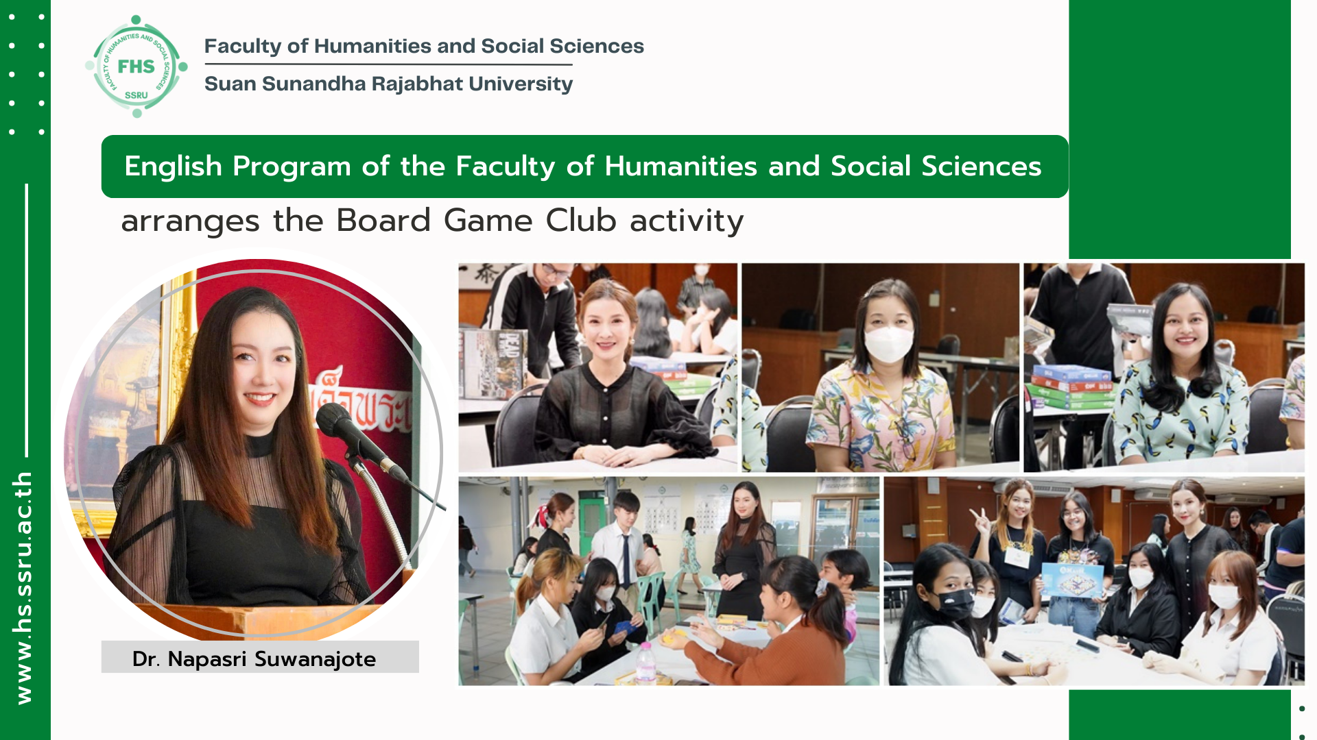 February 13, 2024 – Dr. Napasri Suwanajote, Dean of the Faculty of Humanities and Social Sciences presided over the opening ceremony of “Board Game Club” by the English Program, led by Aj. Patcharaphan Susamawathanakun (Associate Dean for Administration), together with Dr. Angkana Sukwises, Associate Dean for Academic Affairs, and Asst. Prof. Dr. Jiraporn Adchariyaprasit (Associate Dean for Student Affairs) at Nibha Nobhadol Meeting Room, 2 Fl., and the multi-purpose yard, 1 Fl., Building 35.