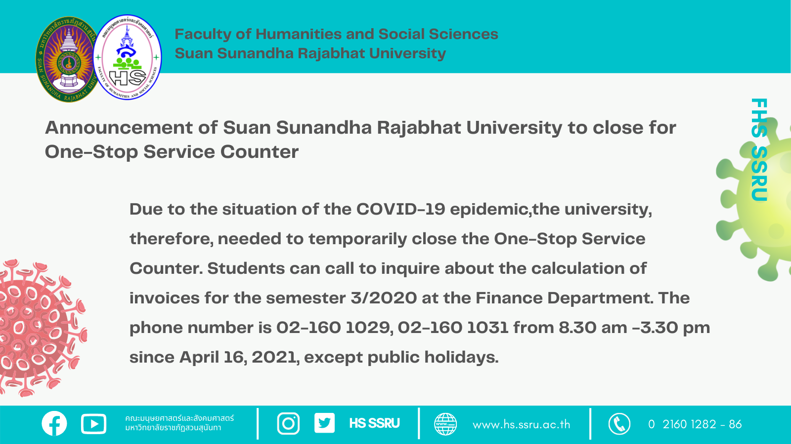 Due to the situation of the COVID-19 epidemic, the university, therefore, needed to temporarily close the One-Stop Service Counter. Students can call to inquire about the calculation of invoices for the semester 3/2020 at the Finance Department. The phone number is 02-160 1029, 02-160 1031 from 8.30 am -3.30 pm since April 16, 2021, except public holidays.
