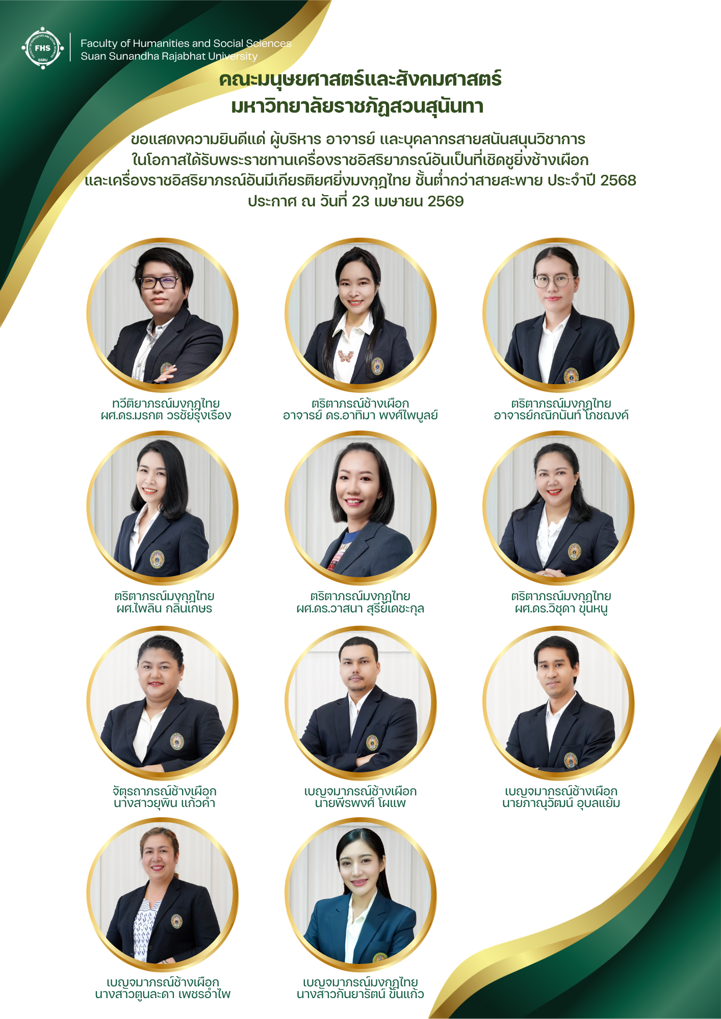 ขอแสดงความยินดีแด่ ผู้บริหาร อาจารย์ และบุคลากรสายสนับสนุนวิชาการ ที่ได้รับพระราชทานเครื่องราชอิสริยาภรณ์ อันเป็นที่เชิดชูยิ่งช้างเผือกและเครื่องราชอิสริยาภรณ์อันมีเกียรติยศยิ่งมงกุฎไทย ชั้นต่ำกว่าสายสะพาย ประจำปี 2568