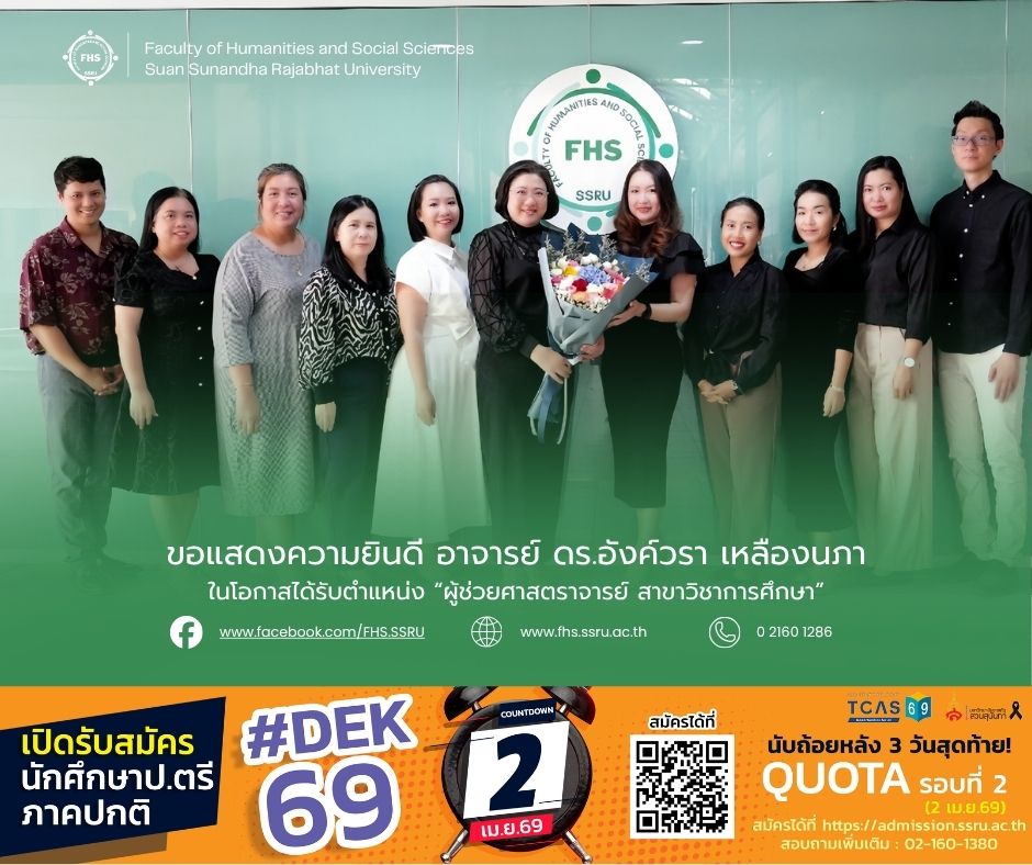 วันที่ 26 มีนาคม 2569 อาจารย์ ดร.นภาศรี สุวรรณโชติ คณบดีคณะมนุษยศาสตร์และสังคมศาสตร์ พร้อมด้วยรองคณบดี หัวหน้าสำนักงานและบุคลากร คณะมนุษยศาสตร์และสังคมศาสตร์ ร่วมแสดงความยินดีแก่ อาจารย์ ดร.อังค์วรา เหลืองนภา รองคณบดีฝ่ายพัฒนาธุรกิจและจัดหารายได้ ในโอกาสได้รับตำแหน่ง “ผู้ช่วยศาสตราจารย์ สาขาวิชาการศึกษา” ณ สำนักงานคณบดีคณะมนุษยศาสตร์และสังคมศาสตร์