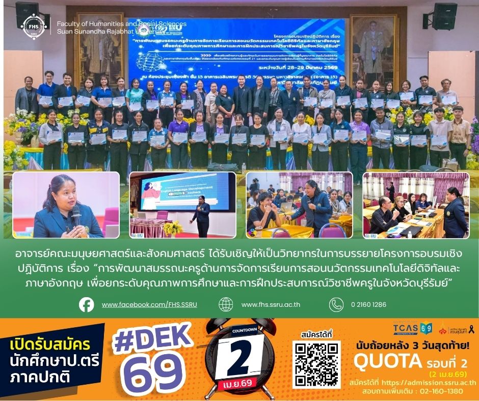 อาจารย์ Charlotte Amalie Yuson อาจารย์ประจำสาขาวิชาภาษาอังกฤษธุรกิจ คณะมนุษยศาสตร์และสังคมศาสตร์ ได้รับเชิญให้เป็นวิทยากรในการบรรยายโครงการอบรมเชิงปฏิบัติการ เรื่อง “การพัฒนาสมรรถนะครูด้านการจัดการเรียนการสอนนวัตกรรมเทคโนโลยีดิจิทัลและภาษาอังกฤษ เพื่อยกระดับคุณภาพการศึกษาและการฝึกประสบการณ์วิชาชีพครูในจังหวัดบุรีรัมย์” เพื่อเสริมสร้างความรู้และทักษะในการออกแบบการจัดการเรียนรู้ที่บูรณาการ เทคโนโลยีดิจิทัลและภาษาอังกฤษในชั้นเรียน ให้สอดคล้องกับทักษะแห่งศตวรรษที่ 21 และยกระดับคุณภาพผู้เรียนในสถานศึกษาของจังหวัดบุรีรัมย์ ซึ่งจัดขึ้นในวันที่ 19, 26 และ 29 มีนาคม 2569 ณ ห้องประชุมเฟื่องฟ้า ชั้น 15 อาคารเฉลิมพระเกียรติ 50 พรรษา มหาวชิราลงกรณ์ (อาคาร 15) มหาวิทยาลัยราชภัฏบุรีรัมย์