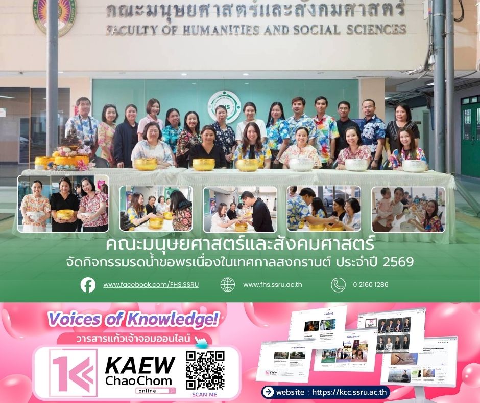 เมื่อวันที่ 7 เมษายน 2569 เวลา 16.00 น. อาจารย์ ดร.นภาศรี สุวรรณโชติ คณบดีคณะมนุษยศาสตร์และสังคมศาสตร์ พร้อมด้วยรองคณบดี คณาจารย์ และบุคลากรของคณะฯ เข้าร่วมกิจกรรมรดน้ำขอพรเนื่องในวันสงกรานต์ หรือวันขึ้นปีใหม่ไทย ประจำปี 2569 เพื่อสืบสานวัฒนธรรมอันดีงามของไทย